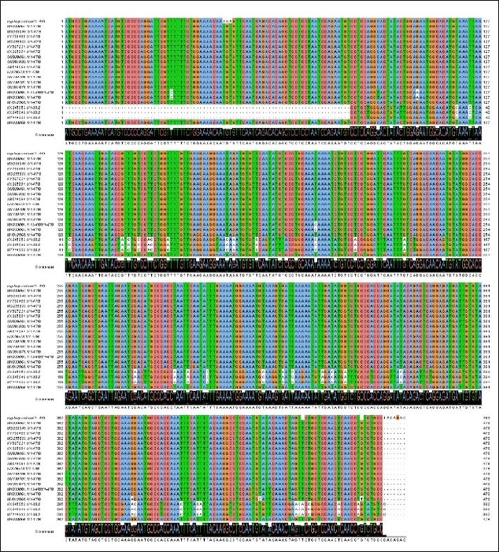 Fig. 3. The multiple sequence alignment between 21 sequences of orthologous COWP gene of Cryptosporidium species, and it revealed that there were almost similarities. The black line represented the consensus of each nucleotide, which occurs most frequently at that site in the different sequences.