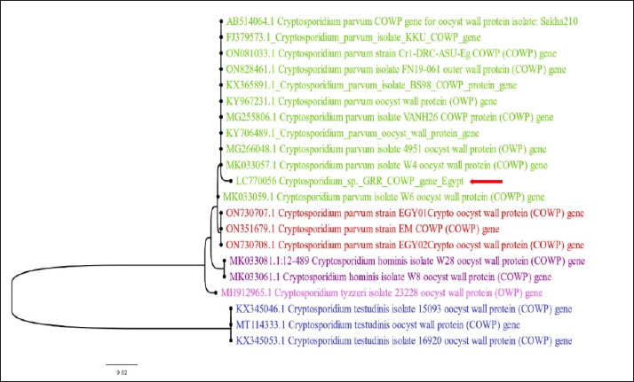 Fig. 4. Maximum-likelihood phylogenetic tree between 21 sequences of orthologous COWP gene of Cryptosporidium species from Egypt and global world. There were five clades represented in different colors. The study Cryptosporidium strain GRR from calf in Egypt is pointed with red arrow (LC770056), which clustered with Cryptosporidium parvum isolates and close to the other isolates from Egypt.