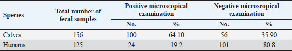 Methods: Using direct wet smear, sedimentation technique, simple fecal flotation technique, and modified Ziehl–Neelsen staining technique, the parasitological analysis was conducted on fecal samples from 156 diarrheic calves and 125 humans in Menoufia governorate; polymerase chain reaction and phylogenetic analysis were further used.