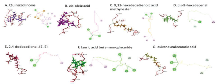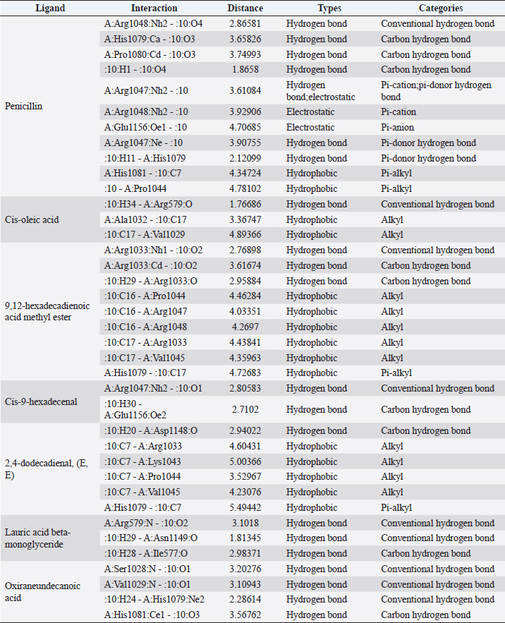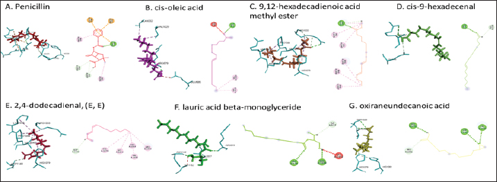 Fig. 4. 3D and 2D views of interactions between IARS and target ligands. DiscussionAntibiotic sensitivity, disk diffusion test, and dilution testThe four bacteria used in this study were multidrug-resistant (MDRs). Resistant bacteria will adversely affect the environment and hosts, especially humans (Nadăs et al., 2021). Aeromonas is currently showing global MDR on strains that infect ornamental fish and food fish (Dhanapala et al., 2021). The results showed that A. hydrophila bacteria resisted the same antibiotics as A. salmonicida. MRSA bacteria are more resistant to antibiotics than S. aureus. Staphylococcus aureus and MRSA bacteria showed they were still sensitive to bacitracin antibiotics. Bacitracin use for treating systemic infections is limited because it shows high nephrotoxicity (Bessa et al., 2016). The ability of the extract to kill bacteria (bactericidal) observed in the MBC test required concentration two times higher than the concentration needed to inhibit bacterial growth (bacteriostatic) through the MBC test. The effect of the extract as bactericidal or bacteriostatic in vitro depends on the growth medium used (optimal MHA medium for antibacterial sensitivity test) and the concentration of the bacteria being tested. Bactericidal is the direct ability of antibacterial agent to kill target bacteria cells. At the same time, bacteriostatic requires phagocytic cells to prevent bacterial growth, so it is less effective to use without good immunity from host cells. Thus, for unhealthy individuals, especially under immunosuppressive conditions, it is more recommended to use an antibacterial with a bactericidal effect than a bacteriostatic one (Nemeth et al., 2015). The content of BSF prepupae methanol extractThe fatty acid contents in the methanol extract of BSF prepupae were myristic acid, stearic acid, palmitic acid, pentadecanoic acid, oleic acid, palmitoleic acid, arachidic acid, lauric acid, and linoleic acid. The highest fatty acid contents in the extract were palmitic acid and myristic acid. Saturated fatty acids (SFAs) such as lauric acid, stearic acid, palmitic acid, and capric acid can Fight broad-spectrum bacteria (Casillas-Vargas et al., 2021). This study showed that methanol extract affected Gram-positive bacteria such as S. aureus more than Gram-negative bacteria such as Aeromonas. The methanol extract from the BSF prepupa contains long and medium-chain fatty acids. Being hydrophobic, it is difficult for them to penetrate the hydrophilic bacterial cell membrane to kill the bacteria (Agoramoorthy et al., 2007). Fatty acids can prevent adhesion and biofilm formation and maintain the pH of the body's surface to be acidic, allowing it to kill certain bacteria. The most potential SFA as an antibacterial agent is lauric acid, while the un SFA is oleic acid, which kills S. aureus bacteria (Jumina et al., 2019). Research conducted by Casillas-Vargas et al. (2021) showed that lauric acid has more potential as an anti-bacterial agent against Gram-positive bacteria such as Staphylococcus and Streptococcus than against Gram-negative ones such as Escherichia coli. Monolaurin and its derivatives work by binding directly to the lipid bilayer of S. aureus bacteria to cause bacterial cell membrane damage and death.