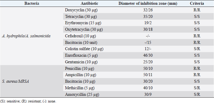 AbstractBackground: Staphylococcus and Aeromonas bacteria are pathogens in humans and animals. The therapy disrupts the virulence structure of the bacteria, resulting in bacterial death. Currently, chemical drugs have resulted in many resistant bacteria, so it is necessary to find alternative natural materials that are not toxic and do not quickly induce resistance. Aims: This study aimed to analyze the potential of methanol extract from Black soldier fly (BSF) prepupae as an antibacterial agent against Staphylococcus aureus and Aeromonas through in silico and in vitro tests. Methods: The BSF prepupae methanol extract was analyzed for protein and fatty acid contents. Disc diffusion method, minimal inhibitory concentration, and minimum bactericidal concentration test were used for in vitro tests against Staphylococcis and Aeromonas. Molecular docking of the active ingredients (defensin, chitin, and chitosan as well as fatty acids) in BSF was downloaded from the NCBI database and docked by the Hex Cuda version 8.0 program with Correlation type parameters Shape + Electro and Grid Dimension version 0.6. Docking results were analyzed using the Discovery Studio program version 21.1.1. Results: The highest fatty acid contents in the extract were palmitic acid and myristic acid. Methanol extract from BSF prepupae acted as a bactericidal agent against S. aureus at a concentration of 320 mg/ml, in contrast to Aeromonas, which still showed bacterial growth. The results of the in silico test showed that defensin–aerolysin and defensin–hemolysin was bound to the same active site area. However, the amount of binding energy produced by 69-Defensin-83-aerolysin was higher than all defensin types in BSF against Aeromonas. Chitin and chitosan showed a bond on the active site of aerolysin and hemolysin, but chitosan had a stronger bond than chitin. In silico study also showed the strongest binding affinity of BSF fatty acids to isoleucyl-tRNA synthetase of S. aureus. Conclusion: The study showed that methanol extract from BSF prepupae had potential capability as an antibacterial agent against S. aureus than Aeromonas in vitro and in silico. Keywords: Aeromonas, Staphylococcus aureus, Prepupae, Antimicrobe, Methanol extract. IntroductionAeromonas spp. bacteria are opportunistic pathogens and can cause disease in fish under immunosuppressive conditions or act as secondary infections. Motile Aeromonas septicemia is chronic, so the mortality rate is high (AlYahya et al., 2018), and it is resistant to multidrug antibiotics, which allows the bacteria to survive. Aeromonas salmonicida) is one of five quarantine fish diseases in Indonesia that requires special attention (Kementrian Kelautan dan Perikanan (KKP) RI, 2021). Staphylococcus aureus is a typical flora on the skin, mucous membranes, and skin glands in warm-blooded animals, and about 30% colonize humans (Tadesse et al., 2018). Staphylococcus aureus has zoonotic potential as it can be transmitted from dogs to humans (Nadăs et al., 2021). Staphylococcus aureus is a crucial bacterium that causes infection in humans worldwide. This bacterial infection requires prompt treatment because it can be fatal in immunosuppressed patients susceptible to bacterial resistance (Cortes et al., 2020). The main targets of antibiotics in Staphylococcus sp. are cell walls, ribosomes, and nucleic acids (Foster, 2017). β-lactam antibiotics as the drug of choice against S. aureus infection have become ineffective since the emergence of methicillin-resistant S. aureus (MRSA) strains (Qureshi and Chaudhari, 2019). To overcome this problem, we need novel antibacterial agents from natural ingredients that are effective, non-toxic, and have no risk of causing resistance to bacteria. Black soldier fly larva (BSFL) is widely used in the community because it can produce fatty acids and bioactive ingredients such as antimicrobial peptides (AMPs; Nardiello et al., 2022). BSF prepupae contains 32% proteins, 37% lipids, 19% minerals, and 9% chitin (Caligiani et al., 2018). Antimicrobial peptides act against broad-spectrum and resistant bacteria (Alvarez et al., 2019). The fatty acid content in BSF prepupa extract can act as an antibacterial, anti-inflammatory, and wound-healing agent (Casillas-Vargas et al., 2021). There are various BSF active ingredients, so this study aims to analyze prepupa BSF as an antibacterial against Aeromonas and S. aureus. Materials and MethodsPreparation of S. aureus and MRSA bacteria and antibiotic sensitivity testBacteria were cultured in the Faculty of Medicine, Universitas Brawijaya. Bacteria were grown in BPA (Baird Parker Agar) (Merck™) media and incubated at a temperature of 35 C ± 1°C, which showed presumptive growth of S. aureus, namely black colonies with a clear zone around it (halo-shaped), afterward Gram staining, catalase, oxidase, and coagulase tests were performed (Javid et al., 2018). The bacteria were then grown on brain heart infusion broth (BHIB) media (Merck™) to make a suspension that would be used for disk dilution and diffusion tests. The antibiotics used for disk diffusion were penicillin (P), methicillin (MET), ampicillin (AMP10), bacitracin (B), and amoxicillin (AMX) (Oxoid™). Preparation of A. hydrophila and A. salmonicida bacteria and antibiotic sensitivity testBacteria from BHIB media were grown on Trypticase Soy Agar media (Merck™) and incubated at 27°C for 24 hours, and then biochemical tests were carried out (Al Laham and Al Fadel, 2014). The several antibiotic discs include oxytetracycline (OXY), doxycycline (DOXY), tetracycline (TE), erythromycin (ERY), cefadroxil (CFR), bacitracin (B), colistin sulfate (CS), gentamicin (CN), and enrofloxacin (ENR) (Oxoid™). The results of the antibiotic sensitivity test were adjusted to the tables of the Clinical and Laboratory Standards Institute M45 (CLSI, 2015) and M100 (CLSI, 2021). Preparation of BSFL growth mediaThe study used 7-day-old BSFL. The BSFL were grown on organi