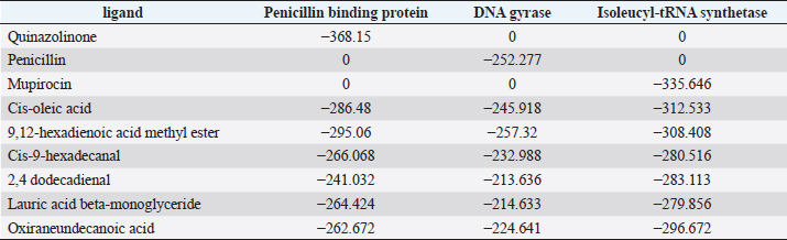 Active ingredients in methanol extract from BSF prepupaeThe study showed that fatty acids in the following percentage were found in the methanol extract of BSF prepupae: myristic acid (21.04), stearic acid (4.62), palmitic acid (25.85), pentadecanoic acid (0.40), oleic acid (18.30), palmitoleic acid (8.58), arachidic acid (0.37), lauric acid (0.03), and linoleic acid (17.6). The highest fatty acids in this study were palmitic acid and myristic acid, while the lowest were arachidic acid and oleic acid. Protein content in the methanol extract of BSF prepupae was 7.44%. Disk diffusion test, MIC, and MBC testInhibition of methanolic extract of BSF prepupae against the growth of S. aureus and MRSA was found at a concentration of 160 mg/ml, indicated by the formation of an inhibition zone (Table 2). The MIC test was not able to determine the ability of the extract to inhibit bacterial growth because the suspension was dark in color at all test concentrations, so the results were read directly from the MBC test, which indicated the killing power or no bacterial growth was found at a concentration of 320 mg/ml. Methanol extract of BSF prepupa could not inhibit growth or kill A. hydrophila and A. salmonicida bacteria at all test concentrations. Molecular docking and analysis of fatty acids to S. aureusThe fatty acids found in BSF are cis-oleic acid, 9,12-hexadecadienoic acid methyl ester, cis-9-hexadecenal, 2,4-dodecadienal, lauric acid beta-monoglyceride, and oxiraneundecanoic acid. The 3D views of those six fatty acid compounds and quinazolinone showed the same binding area as the PBP of S. aureus. These fatty acids and quinazolinone bind to the amino groups of residues Glu 145, Lys 318, Arg 298, Lys 148, Leu 147, His 143, Leu 147, Arg 298, and Thr 300 (Table 3). The bonds between the fatty acid and quinazolinone are electrostatic, hydrogen, and hydrophobic, with the highest affinity of bonds being quinazolinone (Fig. 2). Fatty acid in BSF and penicillin showed inhibition in the same area against DNA gyrase in Figure 2. The same amino acid active site was residues Arg 1048, His 1079, Arg 1047, Glu 1156, His 1079, His 1081, Pro 1044, Arg 579, and Val 1029 (Table 4). The highest interaction of all fatty acids is with IARS consecutively are Cis-oleic acid (−312.533 kcal/mol); 9,12-hexadienoic acid methyl ester (−308.408 kcal/mol) and Lauric acid beta-monoglyceride (−279.856 kcal/mol). This interaction was higher than PBP and DNA gyrase (Fig. 3, Supplementary data in Table 6). There is a favorable bond between Mupirocin and fatty acids in IARS. Mupirocin has a higher binding activity than fatty acids of BSF to IARS. There are beneficial interactions at the same active site between Mupirocin and fatty acids on IARS, namely residues Trp 528, Pro 56, Trp 562, Pro 100, Val 588, and His 64 (Table 5). The highest ligand complex binding energy (fatty acid of BSF, penicillin, quinazolinone, and Mupirocin) to the protein of S. aureus is PBP’s on Quinazolinone, to DNA gyrase is penicillin and to IARS is Mupirocin (Fig. 4; Supplymentary data in Table 6). Molecular docking of peptide defensin to AeromonasProtein defensins like BSF were predicted with peptide cutter and trypsin enzyme to produce 10 peptides with amino acid sequence lengths of 1–53 (unpublished data). Five of ten sequences of bioactive defensin peptides were selected (AVCNCR; GGWCDGR; ATCDLLSPFK; VGHAACALHCIALGR; SVLVLGLIVAAFAVYTSAQPYQLQYEEDGLDQAVELPIEEEQLPSQVVEQHYR). Table 2. Antibacterial sensitivity test of methanol extract of BSF prepupae.
