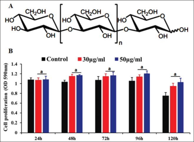 Fig. 1. (A) Chemical structures of β-glucan. (B) The effects of β-glucan on PAMs cell at the cell viability by MTT assay. The data are presented as the mean ± SEM of three independent experiments indicating the significant differences between the control and treatment groups were determined by a one-way analysis of variance. a: p < 0.05. Cell proliferation was measured by MTT assay: briefly, PAMs were harvested, counted by hemocytometer, and diluted with medium, yielding a concentration of 106 cells/ml. From this cell suspension, 100 μl was pipetted into 96-well microtiter plates (Nunc, Denmark) and incubated for 24 hours in a 5% CO2 incubator at 37°C. Cells were then treated with 30 and 50 µg/ml of glucan. After adding the glucan, a new medium was added to make the final volume of 200 μl per well. The plate was then incubated in a 5% CO2 incubator at 37°C for 24, 48, 72, 96, and 120 hours for determining the cell proliferation by MTT kit (Abcam, Waltham, MA) according to the manufacturer’s protocols. The HAD assay was performed as described previously (Thanh et al., 2021). The HAD assay was observed for 5 days, and 50% HAD doses (HAD50) were calculated by using the method of Reed and Muench (1938). The genomic DNA of ASFV in the supernatant was detected by the real-time PCR targeting the ASFV p72 gene as recommended by OIE (2012). The IFN-α and IL-6 production induced by β-glucan was also assessed in this study. After 12- or 24-hour treatment, the supernatant was collected, and the cytokine production was determined using a sandwich enzyme-linked immunosorbent assay (ELISA). The cytokines were further analyzed using the porcine IFN-α and IL-6 ELISA kit according to the manufacturer’s instructions (Invitrogen, Waltham, MA). Statistical analysisStatistical analysis was performed using IBM SPSS software (SPSS 23.0 for Windows; IBM, Chicago, IL). A p-value < 0.05 was considered to be statistically significant. Differences among the groups were tested by Duncan’s multiple comparison methods. Ethical approvalThe study was conducted in compliance with the institutional rules for the care and use of laboratory animals and using a protocol approved by the Ministry of Agriculture and Rural Development (MARD) Vietnam (TCVN 8402:2010). Results and Discussionβ-glucan has been demonstrated to enhance the cell proliferation and differentiation of various cells such as macrophage cells (RAW 264.7 cell, THP-1 cell), or T cells (Xiao et al., 2004; Muramatsu et al., 2014; Dos Santos et al., 2019). Several research studies have demonstrated that various forms of β-glucan can be antiviral, antitumor, or antibacterial activities (Xiao et al., 2004; Maity et al., 2019; Wang et al., 2019, 2022; Liu et al., 2021; Krishnan et al., 2022). Furthermore, β-glucan can be used as an immunomodulator, particularly acting as a stimulator of cytokine production in vitro and in vivo (Werner et al., 2009; Maity et al., 2019; Wang et al., 2019). We investigated if the β-glucan would or could affect ASFV growth and the production of important immune system cytokines such as IFNα and IL-6 in PAMs. In this study, β-glucan can enhance PAM cell proliferation as evidenced in two different doses of β-glucan when compared with the untreated control group (Fig. 1B). The rate of survival of PAMs treatment with β-glucan was highest at 50 µg/ml β-glucan, especially at 120-hour post-treatment, compared to un-treatment and 30 µg/ml β-glucan. Our results demonstrated that 30 or 50 µg/ml β-glucan can enhance cell survival in a dose-dependent manner and these effects remained until 120 hours compared with the control. Recently, several reports demonstrated that β-glucan can inhibit the growth of several pathogens such as leptospira, influenza, mycobacteria, and tuberculosis (Hetland et al., 1998; Wang et al., 2019; Moorlag et al., 2020). However, the potential effects of β-glucan against ASFV infection in the host remained unclear. To evaluate the role of β-glucan against ASFV infection, two doses of β-glucan (30 and 50 µg/ml) were used to show efficacy against a field ASFV strain isolated in Vietnam at 103 HAD50/ml. As shown in Figure 2A, PAMs pre-incubated with β-glucan for 2 hours reduced significantly ASFV invasion at 12 hours post-infection compared with the control group. These effects remained statistically until 24 hours and then reached normal levels at 36 hours post-infection. Moreover, the titer of ASFV confirmed by HAD assay showed that the titer of ASFV was significantly reduced at 12 hours post-infection when compared to the positive control. Specifically, the titer of the virus at 12 hours post-infection was 102.16 HAD50/ml for 50 µg/ml of β-glucan and 102.40 HAD50/ml for 30 µg/ml of β-glucan, when compared to a positive control (102.67 HAD50/ml) with p < 0.05 (Fig. 2B). A modest effect at living viral levels was noted at 24 hours post-infection in this study. Similarly, the antiviral activity of β-glucan inhibiting the pathogens on macrophages has been demonstrated for influenza A virus, mycobacteria, tuberculosis, and herpes simplex virus 1 and indicated that β-glucan significantly decreased the pathogen growth and induced the cytokines expression through activating the JAK-STAT and TLR signaling pathways, especially produce type I IFN genes (Harada et al., 2006; Wang et al., 2019; Moorlag et al., 2020; Lopes et al., 2021; Perveen et al., 2021; Krishnan et al., 2022; Pan et al., 2022). The findings from our study have shown that β-glucan protected the host against the ASFV invasion in PAMs.