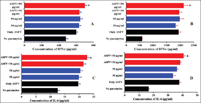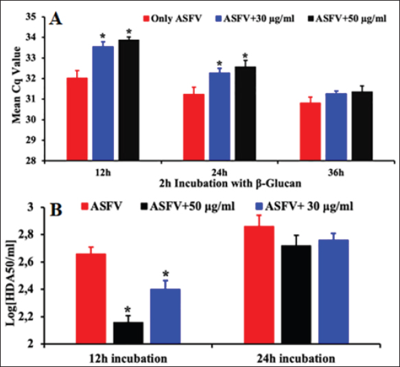 AbstractBackground: African swine fever (ASF) is one of the most important diseases in pigs because of its effects on all ages and breeds. To date, commercial vaccines and drugs for the prevention of ASF are lacking in the market and the survival of African swine fever virus (ASFV) in various environmental, farm, and or feed matrices has allowed the virus to remain, causing new outbreaks in the pig population. Besides biosecurity and animal husbandry management practices, the improvement of the host immune responses is critical to control, managing, and preventing ASF. Aim: In this study, we investigated the protective role of β-glucan against ASFV infection using a porcine alveolar macrophage (PAM) model. Methods: The effects of β-glucan on cell proliferation were evaluated by using the 3-(4,5-dimethylthiazol-2-yl)-2,5-diphenyltetrazolium bromide assay. The potential effects of β-glucan against a field ASFV strain isolated in Vietnam were further examined by real-time PCR and hemadsorption assays. The interferon (IFN)-α and interleukin (IL)-6 protein production induced by β-glucan was determined using a sandwich enzyme-linked immunosorbent assay. Results: Our results demonstrated that the β-glucan additive possessed an immune stimulus factor against ASFV. Specifically, protection of PAMs against ASFV infection in vitro was observed at 12 hours (p < 0.05) at the tested doses (30 and 50 µg/ml) as induced by incubation with β-glucan for 2 hours. These effects remained until 24 hours after post-infection. Additionally, at a high dose (50 µg/ml), pre-treatment with the β-glucan statistically increased the expression levels of IFNα and IL-6 when compared to untreated groups or only ASFV infection. Conclusion: Together, these findings indicated that the β-glucan may protect the host against ASFV infection via the multiple cellular immune mechanisms. Keywords: African swine fever virus, β-glucan, Cytokine. IntroductionAfrican swine fever (ASF) is one of the most important diseases in pigs because of its effects on all ages and breeds and is reported to the World Health Organization for Animal Health (OIE). In Asia, the first ASF outbreak was reported in China in 2018 and the ASF outbreaks were reported in Mongolia, Vietnam, Cambodia, North Korea, Laos, Myanmar, Philippines, South Korea, Timor-Leste, Indonesia, Papua New Guinea, India, and Malaysia (Vergne et al., 2020). African swine fever virus (ASFV) is highly virulent, and both the morbidity and mortality can be up to 100%, depending on the virulence of the virus, the host, and the transmission cycles (Kapoor et al., 2017). To date, the vaccines and drugs for the prevention of ASF are lacking in the market and the survival of ASFV in various environmental, farm, and or feed matrices has allowed the virus to remain to cause new outbreaks in the pig population (Cubillos et al., 2013; Kapoor et al., 2017). Besides biosecurity and animal husbandry management practices, the improvement of the host immune responses is critical to control, manage and prevent ASF. β1,3-D-glucans (β-glucans) are naturally occurring glucose polymers forming structural components of cell walls of several species and are active biologically as immunomodulators or biological response modifiers (Moorlag et al., 2020; Iswarya et al., 2022; Wang et al., 2022). The function of glucans has been well identified and characterized in vivo and in vitro and includes antiviral activities, inhibition of cancer growth, induction of cell proliferation, and reduction of stress or cholesterol level (Anusuya and Sathiyabama, 2015; Dos Santos et al., 2019; Krishnan et al., 2022). Recently, the major function of glucans has been reported as the inhibition of pathogens such as leptospira, mycobacterium, influenza infection, and cancer because it enhances the proliferation and phagocytotic capacity of macrophages, as well as the oxidative burst of monocytes, macrophages, and neutrophils (Hetland et al., 1998; Wang et al., 2019; Moorlag et al., 2020; Peymaeei et al., 2020). In addition, the role of glucans was reported to affect the immune system by induced cytokines expression which is primarily associated with host responses to infectious diseases (Nemoto et al., 1994; Soltys and Quinn, 1999). The research demonstrated that treatment with glucan induced the proliferation of dendritic and macrophages cells, and produced chemokine and cytokines such as interferons (IFNs), tumor necrosis factor (TNF)-α, interleukin (IL)-10, IL-6, IL-12, IL-1β, IL-12, CXCL2 via binding and activation of dectin-1 (a type II transmembrane protein receptor), activated the associated toll-like receptor (TLR) signaling, JAK-STAT signaling, and also NF-κβ signaling pathways (Soltys and Quinn, 1999; Wouters et al., 2002; Harada et al., 2006; Ikeda et al., 2007; Mochizuki et al., 2013; Su et al., 2020). Furthermore, glucan can activate the immune system to produce IFNs which induces the antimicrobial functions of macrophages by increasing pinocytosis and phagocytosis, and enhancing the host inhibition of microbial infections (Soltys and Quinn, 1999; Fan et al., 2006; Werner et al., 2009). In addition, the cell-surface major histocompatibility complex (MHC) class I, class II and related genes have been shown to be upregulated by IFN-γ and IFN-α induction, which increased the cytotoxic T-cell and activation of CD4+ and CD8+ T cells, which play important roles in the host response to infectious diseases (Konopski et al., 1994; Harada et al., 2006). In this study, we evaluated the ability of β-glucan to inhibit the ASFV and produce IFN-α and IL-6 in primary porcine alveolar macrophages (PAMs). Materials and MethodsExperimental designThe β-glucan was provided by Kemin Industries, Singapore and the chemical structures of β-glucan are shown in Figure (1A). To evaluate the potential effects of β-glucan on ASFV infection and cytokine production, the cells were pre-treated with 30 and 50 µg/ml of gluca