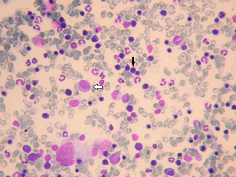 Fig. 3. Promyelocyte (white arrow) and several rubricytes (black arrow). May Grunwald Giemsa ×40 objective. Bone marrow cytological exams is often a second step exam that is requested only after the evidence of a hematological alteration, such as a cytopenia or particular clinical symptoms, like multiple enlarged lymph nodes, or after a suspicion of an infective or neoplastic disease that is known to have a particular tropism for the bone marrow tissue, like, for example, Leishmania Infantum protozoa (Harvey, 2012; Turinelli et al., 2015). In this retrospective study of 613 myelograms, we found 85 (14%) normal bone marrow cytological exams that were performed because of several reasons. A previous study (Weiss, 2006) reported a higher percentage of 21.8%. The most important indication was an already underlined hematological alteration (50.6% of the total cases), followed by a suspicion of bone marrow neoplastic infiltration (30.6% of the total cases). Only 11.8% of the bone marrows were performed because of a suspicion of infective disease, more often Leishmania Infantum, followed by Ehrlichia Canis. A small proportion (7%) of bone marrow cytological exams had an unknown indication and clinical history. For all the bone marrow exams a new CBC was performed, no matter if there was already a hemogram done. Of the 85 normal bone marrow samples, only 28 (32.9%) were associated to a normal CBC and could be considered, with a high grade of certainty, representative of a good functioning hematopoietic tissue. The other normal cytological bone marrow exams (67.1%) were associated to several hematological abnormalities, which the most important one was anemia alone (25.9%), or associated to other cytopenia, like for example, thrombocytopenia (11.8%). Only few cases (4.6%) had a pancytopenia. A bone marrow cytological exam without any morphological or numerical abnormalities but associated to one or more peripheral cytopenia should not be considered truly normal; the cytopenia should be considered, at least partially, of central origin, more often if there is bicytopenia or pancytopenia. A well-functioning bone marrow tissue should respond to a peripheral hypoxia following an anemia and the releasing of erythropoietin principally by the kidney, as well as the releasing of other cytokine that are produced in response to a particular cytopenia like, for example, thrombopoietin or granulocytic stimulating factor. If this do not happen, a bone marrow listlessness or a cytokine deficiency or inadequate production should be suspected. In these cases, a dosage of the relevant cytokine and a second myelogram, associated to a core biopsy for a simultaneous histological exam, should be performed in the next days, because, probably, some hypoplastic condition will appear. Table 1. Cytological bone marrow examination’s indications.