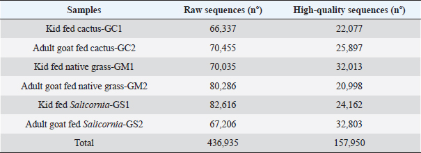 AbstractBackground: The Peruvian coast is characterized by its arid and saline soils, the cactus being an alternative for arid soils and Salicornia for saline soils. Therefore, it is necessary to develop nutrition based on the intestinal microbiota in goats. Aim: To identify the intestinal microbiota in goats through a metagenomic analysis. Methods: In this study, goats and kids were randomly selected and fed cacti and Salicornia as potential forage species compared to native grass to study the changes in the microbiota using massive sequencing using the 16S rRNA gene as a marker. Results: The sequencing results showed the taxonomic levels of Bacteroidetes and Firmicutes at the phylum level as the most abundant in creole goats’ microbiome, varying from 18% to 36% and 47% to 66%, respectively. At the genus level, variants of the genus Ruminococcaceae stand out, related to cellulose degradation, as the most dominant in all samples, followed by Christensenellaceae, Rikenellaceae, and Prevotellaceae. Also, the genus Akkermansia appeared in greater abundance in kids fed with cactus, being necessary for being related to the intestinal mucosa’s health and avoiding the adhesion of pathogens to the intestinal epithelium. Conclusion: These microbiota changes based on diets with high fiber content are necessary to understand the adaptation of this species to favorable dietary changes. Keywords: Microbiota, Forage, Ruminants, Bacteria, Bioinformatic. IntroductionThe diverse and complex symbiotic microbial community that houses the intestinal tract contributes significantly to the health and disease of mammals. These microbes, led in a higher proportion by bacteria, play a crucial role in the host’s nutrition, physiology, behavior, metabolic, and regulatory networks (McFall-Ngai et al., 2013). Many of these microbes are specifically inherited and unchanged over time through a maternal transfer to the infant (Funkhouser and Bordenstain et al., 2013), and which in turn, from birth, is rapidly colonized by a microbial community (Frese et al., 2015), and in its subsequent development it changes depending on the genetics, environmental variables, and diets of the host (Benson et al., 2010). In diets, such as the diet based on plant fibers (pectin, cellulose, and xylan) considered the primary natural food source, it models the shape and performance of the diverse microbial community in ruminants, generating carbohydrates, short-chain fatty acids, and proteins that are absorbed through the different areas of the gastrointestinal organ (Jiang et al., 2020), which are essential for its growth, reproduction, thermoregulation, and immunity of the host. For many years, studying this microbiota in ruminants has been vital to improving their production (Egan, 2005). These studies were based on traditional techniques through routine enzymatic assays to quantify cellulase, xylanase, and proteolytic activity (McSweeney et al., 2005). They managed to isolate several species that, at the time, were only related to digestion and pathogenicity. Today, with the biotechnological advances in massive DNA sequencing, an unprecedented number of researches related to microorganisms have opened, especially in noncultivable ones. These initiatives have generated massive amounts of publicly available data that have significantly increased the depth and breadth of knowledge of the gut microbiome in many species and environments (Allali et al., 2017). In Perú, the production of creole goats on the northern coast stands out for their ability to withstand long months of drought, with good fertility and milk production traits. However, traditional breeders’ inadequate technical preparation preserves this activity with a precarious diet based on harvest residues, natural forages, and seasonal shrub species from dry forests, thus limiting their development and production (Arroyo, 1998). Therefore, new breeding methods, health, and livestock feeding are urgently needed to improve the producers’ economic resources and living conditions. A great alternative to increasing goats’ livelihood in critical periods is by incorporating forage species from arid zones such as succulents into their nutrition. With a high prevalence in northern Perú, these plants have high nutritional values that allow reaching the productive levels necessary for goat development (Guevara and Estévez, 2001). In this study, young and adult goats were fed with cacti and Salicornia as potential forage species compared to native grass to study the changes in the microbiota using massive sequencing using the 16S rRNA gene as a marker. Materials and MethodsSample collectionThe research was carried out on the farm of the Instituto de Educación Superior Tecnológico Público 24 de Julio, Zarumilla, Tumbes, Perú. The experimental specimens of similar age and weight were randomly selected from 30 adult goats (approx. 4 years) and 30 young goats (3 months). The study was divided into three groups: group I (GS) formed by two animals (adult goat and kid) and fed with Salicornia; Group II (GC) also consisting of the same set up as the former and fed with cactus; and the control group (GM) fed with local natural forage (Table 1) to evaluate the effect of these diets on the intestinal microbiota, to develop an efficient nutrient plan for the animals. Extraction of DNAThe samples were obtained 21 days after the end of the investigation. The fecal samples were taken directly from the anus of each of the specimens belonging to each treatment and were taken to the laboratory to be stored at 4°C for their respective processing. The extraction of genomic DNA from the samples was carried out using the Quick-DNATM Fecal/Soil Microbe Miniprep Kit following the supplier’s steps. The quality of the extracted DNA was carried out by 1.5% agarose gel electrophoresis (Huang et al., 2018). The metagenomic DNA samples obtained were stored at −20°C. Sequencing and bioinformatics 