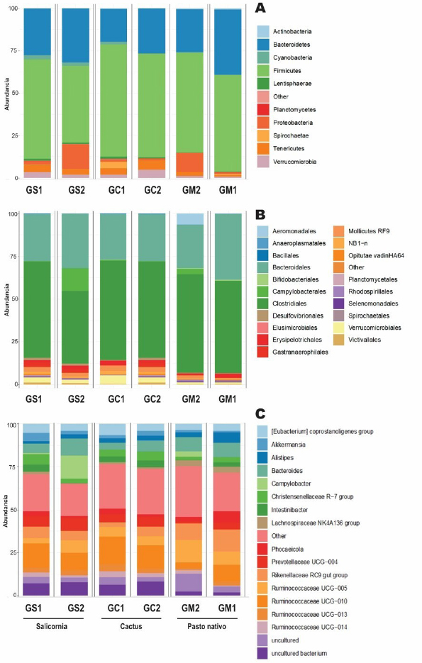 Fig. 2. The relative abundance of bacterial communities on the effect of the Salicornia GS1 and GS2, cactus GC1 and GC2 diets compared to the native grass GM1 and GM2 diet in C. hircus. (A) Phylum level: all remaining taxa with abundance <1% are summarized as others. (B) Order level: all remaining taxa with abundance <1% are summarized as others. (C) Genus level: all remaining taxa with abundance <1% are summarized as others.