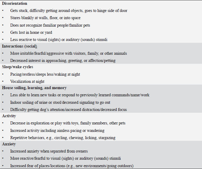 Table 2. DISHAA (Disorientation; Interactions-social; Sleep/wake cycle; House soiling, learning and memory; Activity; and Anxiety) scoring system used to assess cognitive ability in dogs. Each subcategory (bullet point) is scored as: 0=none, 1=mild, 2=moderate, and 3=severe. Total scores are assessed as: 4–15=mild impairment, 16–33=moderate impairment, >33=severe impairment.