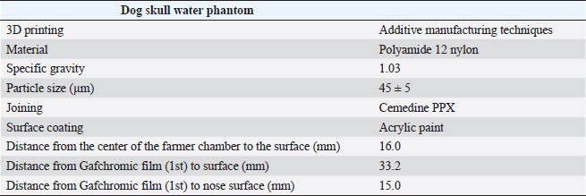 Open Vet. J.. 2023; 13(4): 427-432 Open Veterinary Journal, (2023), Vol. 13(4): 427–432 Original Research Improving animal-specific radiotherapy quality assurance for kilovoltage X-ray radiotherapy using a 3D printed dog skull water phantomYoshinori Tanabe1*, Toshie Iseri2, Ryouta Onizuka3, Takayuki Ishida4, Hidetoshi Eto5 and Munekazu Nakaichi61Faculty of Medicine, Graduate School of Health Sciences, Okayama University, Okayama, Japan 2Faculty of Agriculture, Animal Medical Emergency Center, Tokyo University of Agriculture and Technology, Fuchu, Japan 3Department of Radiology, Kokura Memorial Hospital, Kitakyusyu, Japan 4Division of Health Sciences, Graduate School of Medicine, Osaka, Japan 5Department of Radiology, Yamaguchi University Hospital, Ube, Japan 6Joint Faculty of Veterinary Medicine, Yamaguchi University, Yamaguchi, Japan *Corresponding Author: Yoshinori Tanabe. Faculty of Medicine, Graduate School of Health Sciences, Okayama University, Okayama, Japan. Email: tanabey [at] okayama-u.ac.jp Submitted: 21/11/2022 Accepted: 10/03/2023 Published: 09/04/2023 © 2023 Open Veterinary Journal