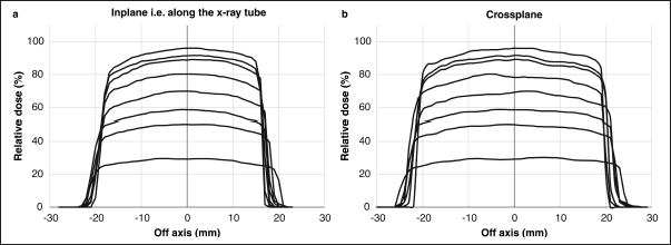 Fig. 1. Measured dose profiles along the two axes using film (a: in plane i.e., along the X-ray tube; b: cross plane). This figure was referred the Figure 3 of reference Iseri et al., 2023. Figure 2 shows the Monte Carlo simulation percentage depth dose and the measured percentage depth dose. The dose difference between the measured dose and beam modeling was adjusted to within at least 2.0% along the central axis. Figure 3 shows the radiation dose distributions estimated by Monte Carlo simulations for linear accelerator radiotherapy under near-irradiation conditions and for orthovoltage radiation. The absorbed dose to the skull near the surface with orthovoltage radiation was similar to that of the single port irradiation, and the reduction rate of orthovoltage radiation was high. The percentage depth dose in bone with orthovoltage radiotherapy was more than 40%. With orthovoltage radiotherapy, a build-up of more than 40% was seen in the bone region, with build-down after bone transmission (Fig. 4a). With linear accelerator radiotherapy, there was little change in absorption in the bone region, although a slight rebound was seen after bone transmission (Fig. 4b). Figure 5 shows the water phantom that was created using a 3D printer. The dog skull water phantom was water impermeable, had inserts for Farmer dosimetry chambers and two sheets of Gafchromic film, and could be used to perform animal-specific radiotherapy QA. DiscussionIn small animals, radiotherapy is often performed in shallow areas. The use of Monte Carlo simulations to aid dosimetry is helpful for evaluating dose distribution, but in veterinary medicine education, visual simulation phantoms can be quicker to use and learn from. In this study, the use of simulated doses and measurements in a water phantom provided us with an understanding that could be applied to create a 3D printed animal-specific dog skull water phantom with appropriate inserts for dosimetry chambers and Gafchromic sheets that was water impermeable and had high gas impermeability and permitted pre-treatment radiotherapy QA. As shown by the results of the off-axis ratios, the heel effect is seen at a shallow depth of about 1.5 cm, a finding that is reflected in past research (Knöös et al., 2007; Azim et al., 2015). The radiation field size was asymmetric, which may change over time because this study’s orthovoltage machine was made more than 20 years after its introduction. Additionally, since vendors fine-tune the beam quality and target angle at each facility, we believe that beam modeling per facility, as for linear accelerator equipment, is essential. Table 2. The ratio of dose difference for10 mm off axis at each side.