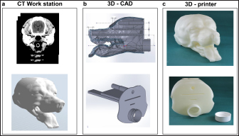 Fig. 5. Workflow for creating the dog skull water phantom (a: 3D workstation; b: 3D-CAD; c: 3D printer). ConclusionBy using Monte Carlo simulations, physical phantom measurements, and a 3D printer, we could visualize the radiation treatment distribution of orthovoltage X-ray equipment in clinical practice. This technique will be beneficial for animal-specific radiotherapy QA and veterinary medicine education. Conflict of interestThe authors declare no conflicts of interest. FundingWe gratefully acknowledge support from the Japanese Society of Radiological Technology (JSRT) Research Grant (2018). Authors’ contributionsYT, IT, RO, and MN were involved in study design and data interpretation. IT and HE were involved in data analysis. All authors critically revised the report, commented on the drafts of the manuscript, and approved the final word. ReferencesAbbas, H., Mahato, D.N., Satti, J. and MacDonald, C.A. 2014. Measurements and simulations of focused beam for orthovoltage therapy. Med. Phys. 41, 041702. Andreo, P. 1991. Monte Carlo techniques in medical radiation physics. Phys. Med. Biol. 36, 861–920. Azer, S.A. and Azer, S. 2016. 3D anatomy models and impact on learning: a review of the quality of the literature. Health. Prof. Educ. 2, 80–98. Azim, R., Alaei, P., Spezi, E. and Hui, S.K. 2015. Characterization of an orthovoltage biological irradiator used for radiobiological research. J. Radiat. Res. 56, 485–492. Iseri, T., Tanabe, Y., Horikirizono, H., Sunahara, H., Itoh, H., Nemoto, Y., Itamoto, I., Tani, K., Tanaka, H. and Nakaichi, M. 2022. Adjustment of multi-leaf collimator parameters in 4-MV and 6-MV IMRT: a study of veterinary clinical cases. Open. Vet. J. 12, 407–413. Iseri, T., Tanabe, Y., Onizuka, R., Torigoe, Y., Horikirizono, H., Itamoto, K., Sunahara, H., Itoh, H., Tani, K. and Nakaichi, M. 2023. A Monte Carlo study on dose distribution of an orthovoltage radiation therapy system. Phys. Eng. Sci. Med; https://doi.org/10.1007/s13246-023-01237-4. Ji, Z., Jiang, Y., Guo, F., Sun, H., Fan, J., Zhang, L. and Wang, J. 2017. Dosimetry verification of radioactive seed implantation for malignant tumors assisted by 3D printing individual templates and CT guidance. Appl. Radiat. Isot. 124, 68–74. Jones, K.C., Redler, G., Templeton, A., Bernard, D., Turian, J. and Chu, J.C.H. 2018. Characterization of compton-mptonnd imaging with an analytical simulation method. Phys. Med. Biol. 63, 025016. Kamomae, T., Shimizu, H., Nakaya, T., Okudaira, K., Aoyama, T., Oguchi, H., Komori, M., Kawamura, M., Ohtakara, K., Monzen, H., Itoh, Y. and Naganawa, S. 2017. Three-dimensional printer-generated patient-specific phantom for artificial in vivo dosimetry in radiotherapy quality assurance. Phys. Med. 44, 205–211. Kawrakow, I. 2000. Accurate condensed history Monte Carlo simulation of electron transport. I. EGSnrc, the new EGS4 version. Med. Phys. 27, 485–498. Kawrakow, I., Mainegra-Hing, E., Rogers, D.W.O., Tessier, F. and Walters, B.R.B. 2011. The EGSnrc code system: Monte Carlo simulation of electron and photon transport. National Research Council of Canada Report PIRS, p: 701. Knöös, T., Rosenschöld, P.M. and Wieslander, E. 2007. Modelling of an orthovoltage X-rthovoltage oltage ovoltagEGSnrc Monte Carlo package. J. Phys. Conf. Ser. 74, 021009. Ma, C.M., Coffey, C.W., DeWerd, L.A., Liu, C., Nath, R., Seltzer, S.M. and Seuntjens, J.P. 2001. AAPM protocol for 40-300 kV X-ray beam dosimetry in radiotherapy and radiobiology. Med. Phys. 28, 868–893. Medina, L.A., Herrera-Penilla, B.I., Castro-Morales, M.A., García-López, P., Jurado, R., Pérez-Cárdenas, E., Chanona-Vilchis, J. and Brandan, M.E. 2008. Use of an orthovoltage X-ray treatment unit as a radiation research system in a small animal cancer model. J. Exp. Clin. Cancer. Res. 27, 57. Miften, M., Olch, A., Mihailidis, D., Moran, J., Pawlicki, T., Molineu, A., Li, H., Wijesooriya, K., Shi, J., Xia, P., Papanikolaou, N. and Low, D.A. 2018. Tolerance limits and methodologies for IMRT measurement-based verification QA: recommendations of AAPM task group no. 218. Med. Phys. 45, e53–e83. Onizuka, R., Araki, F. and Ohno, T. 2018. Monte Carlo dose verification of VMAT treatment plans using elekta agility 160-leaf MLC. Physica. Med. 51, 22–31. Pampena, R., Palmieri, T., Kyrgidis, A., Ramundo, D., Iotti, C., Lallas, A., Moscarella, M., Borsari, S., Argenziano, G. and Longo, C. 2016. Orthovoltage radiotherapy for nonmelanoma skin cancer (NMSC): comparison between 2 different schedules. J. Am. Acad. Dermatol. 74, 341–347. Rahim, T.N.A.T., Abdullah, A.M., Akil, H.M. and Mohamad, D. Comparison of mechanical properties for polyamide 12 composite-based biomaterials fabricated by fused filament fabrication and injection molding. In AIP Conference Proceedings, 2016, p 1791. Seo, J., Son, J., Cho, Y., Park, N., Kim, D.W., Kim, J. and Yoon, M. 2018. Kilovoltage radiotherapy for companion animals: dosimetric comparison of 300 kV, 450 kV, and 6 MV X-ray beams. J. Vet. Sci. 9, 550–556. Tanabe, Y., Ishida, T., Eto, H., Sera, T., Emoto, Y. and Shimokawa, M. 2020. Patient-specific radiotherapy quality assurance for estimating actual treatment dose. Med. Dosim. 46, e5–e10. Verhaegen, F., Dubois, L., Gianolini, S., Hill, M.A., Karger, C.P., Lauber, K., Kevin M.P., David, S., Thorwarth, D., Vanhove C., Vojnovic, B., Weersink, R., Wilkensl, J.J. and Georg, D. 2018. ESTRO ACROP: technology for precision small animal radiotherapy research: optimal use and challenges. Radiother. Oncol. 126, 471–478. | ||