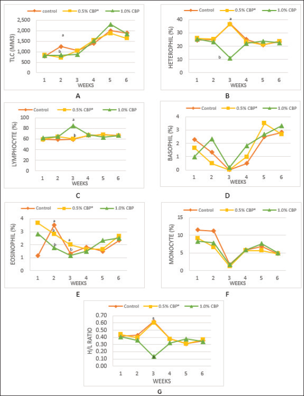 The experiment was designed according to a completely randomized design. Analysis of variance was implemented by using Statistical Analysis System (SAS, 2002), and Duncan’s multiple range tests were used to determine significant differences between treatment means (Duncan, 1955). The studied traits included blood constituents, biochemical parameters, the determination of immune organ masses, and cell-mediated immunity. The blood constituent traits were total leukocyte counts (TLC), differential leukocyte counts (DLC), and heterophil/lymphocyte ratio (H/L). The biochemical parameters were serum cholesterol level (mg/dl) (Allain et al., 1974) and Liver enzymes in the blood: aspartate aminotransferase (AST), alanine aminotransferase (ALT) (Schumann et al., 2002), and alkaline phosphatase (ALP) (IU/l) (Wenger et al., 1984). The determination of immune organ masses was the spleen/body weight ratio and the bursa of Fabricius/body weight ratio (Heckert et al., 2002). The effect of clove in chicken broiler feed on cell-mediated immunity was assessed by the hypersensitivity response of the chicken’s skin to dinitrochlorobenzene (DNCB) as per the method described by Tiwary and Goel (1985). On day 28, six chickens were randomly selected from each group, marked by different colors and sensitized by applying 250 μl of 1% DNCB dissolved in acetone on the side of the right thigh. On day 42 (after 14 days), the same chickens were challenged by topical application of 0.5% DNCB dissolved in a 4:1 mixture of acetone and olive oil on the same sensitized site (sike of the right thigh) and calculated as per the method of Chowdhury et al. (2005). Ethical approvalThis study was approved by the Graduate School of the University of Tripoli, Faculty of Agriculture, Department of Animal Production. All animal welfare protocols were followed. ResultsThe results in Figure 1A show that adding cloves at a rate of 0.5% and 1% to the broiler diet had no significant effect on the TLC compared with the control group at the end of the experiment (6 weeks of age). Nevertheless, the statistical analysis of the second week of the experiment showed a significant decrease (p ≤ 0.05) in the TLC (716.7/mm3 and 833.3/mm3) in the two groups that fed on a diet supplemented with clove powder at a rate of 0.5% and 1%, respectively, compared to the control (1,250/mm3). The results of the statistical analysis of DLC (heterophil, eosinophil, basophil, lymphocyte, and monocyte) in Figure 1B–F show that there was no significant effect of adding clove powder to the broiler diet in the end of the experiment among the experimental groups. While the weekly statistical analysis of the experimental data showed the presence of some significant changes, the results showed a highly negative effect (p ≤ 0.01) on the percentage of heterophil in the third week in the broilers of the third group, which was (11%) compared to the control group (37%). Similarly, there was a significant decrease (p ≤ 0.05) in the second week in the percentage of eosinophils in the second and third groups (2.83% and 1.83%, respectively) compared with the control group (3.50%). On the contrary, the addition of clove powder to the diet of broilers had a highly positive significant (p ≤ 0.001) effect in the second and third weeks on the percentage of lymphocytes, and the increase was the highest in the third group (85.17%) compared with the broilers of the control group (59.83%) in the third week of the experiment. In addition to the above, the results in Figure 1G indicated that supplementation with clove powder caused a significant increase in the H/L-ratio in the third week, while there was no significant effect in the sixth week of the experiment.