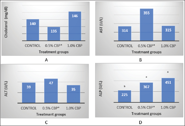 Fig. 2. Effect of adding clove buds powder to broiler feed in different levels on Serum cholesterol level and Liver enzymes at 42 days of the experiment. (*): Clove Buds Powder. Different letters within a treatment indicate a significant difference between the means at the level of probability differences between the means at the level of probability (p < 0.01).