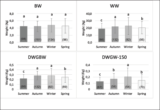 Fig. 1. Lamb productive performance parameters (mean and SD) as a function of the birth season (summer, autumn, winter, and spring). (BW): birth live weight; (DWGBW): average daily live weight gain from birth to weaning; (WW): weaning live weight; (DWGW-150): average daily live weight gain from weaning to 150 days of age. The number of observations (n) in each column is in parentheses. Different letters above the columns indicate differences according to Tukey or Bonferroni test (p < 0.05).