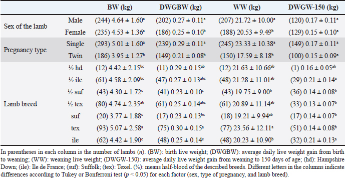 Table 3. Mean (±SD) of the lambs’ productive performance parameters as a function of the evaluated factors inherent to the lamb (sex, type of pregnancy, and lamb breed).