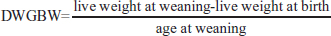 For DWGW-150, the last weighing closest to 150 days of age (WEIGHT150) was considered (approximate age at which the animals were sold). Only live weights between 135 and 165 days of age were used to calculate this index. The DWGW-150 was calculated using the following formula, age is considered in days: