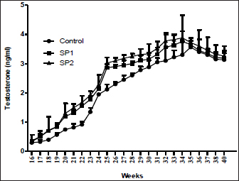 Testosterone concentrationsThe plasma concentrations of testosterone during the experimental period are presented in Figure 1. An increase in linear terms was observed in plasma testosterone levels toward advanced ages in all lambs throughout the pre-pubertal up to the puberty stage. However, testosterone levels were not affected by SP treatment. Furthermore, at all puberty stages, there were no differences in the plasma testosterone concentrations between the lambs’ group (Table 3). Semen propertiesAs stated in Table 5, seminal characteristics (volume, initial motility, live spermatozoa, and sperm cell concentration) at puberty were better (p < 0.05) in SP2 lambs than in control lambs. However, there were no differences between SP1 lambs and their control counterparts regarding the previous seminal properties. In contrast, the sperm cell concentration of SP lambs was higher (p < 0.05) compared with that of control lambs (Table 5).