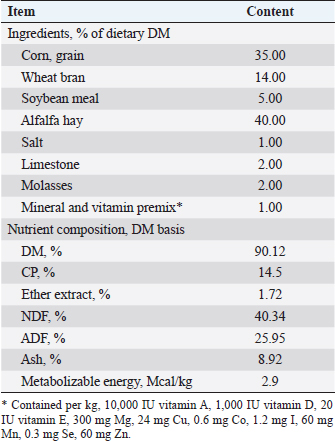 AbstractBackground: The fertility and genetic value of the flock can be enhanced by selecting lambs with highly developed early puberty characteristics. Spirulina (SP) has been evaluated as a natural product supplement to boost lamb growth, immunity, and productivity. Aim: Study growth performance, blood metabolites, puberty development traits, semen quality, and seminal plasma biochemical concentrations of growing Barki lambs when supplemented with SP at different levels. Methods: in a 24 weeks study, 30 Barki male lambs weighing an average of 21.78 ± 2.56 kg, with a body condition score of 3.20 ± 0.55 and an age of about 16 ± 0.24 weeks were used. The lambs were randomly assigned to three groups (10 lambs each) of daily SP supplementation levels per lamb of 0 ml (control), 50 ml (SP1), and 100 ml (SP2). The SP powder was made into a water suspension using SP to water ratio of 1 g:10 ml. The growth characteristics, as well as the development of puberty, blood metabolites, and semen quality analysis of every lamb, were measured. Results: The growth performance was greater (p < 0.05) in SP2 lambs compared with other lambs. While daily dry matter intake was not affected by SP treatment, feed efficiency had significantly improved in SP2 groups. Furthermore, the SP2 lambs have attained puberty at early ages than the control lambs. The testes volume of SP2 lambs was bigger (p < 0.05) than other groups throughout the pre-pubertal up to the puberty stage. The addition of SP had no effects on the total protein, glucose, and triglycerides concentrations. Meanwhile, the cholesterol concentration was lowest (p < 0.05) in the SP2 lambs. The blood and seminal plasma levels of alanine aminotransferase and aspartate aminotransferase decreased (p < 0.05) in the SP lambs more than their control counterparts. The levels of superoxide dismutase reduced glutathione, and total antioxidants had increased (p < 0.05) in the treated lambs compared with the control group. Further, the malondialdehyde levels decreased (p < 0.05) in the SP-treated lambs. Additionally, the SP2 lambs produced better semen quality than the control lambs. Conclusion: SP supplementation (100 ml/head/day) enhanced growth performance, feed efficiency, and antioxidative status, exerting a positive influence on the physiological parameters and sexual behavioral patterns at puberty in Barki lambs. Keywords: Spirulina, Growth performance, Puberty, Semen quality, Barki lambs. IntroductionIn Egypt, three major sheep breeds contribute approximately 6.4% of the total red meat production (Galal et al., 2005). Approximately 8.5% of all Egyptian sheep are Barki sheep (FAO, 2017). Besides being capable of adapting to harsh desert conditions, they also produce substantial amounts of meat, wool, and milk under those conditions (El-Wakil et al., 2008; Abousoliman et al., 2020). The Barki sheep is also a source of income for Egyptian farmers and a source of meat for the locals (Mansour, 2021). Therefore, there is a great deal of interest in understanding how these animals grow and what traits they possess to improve the quality of the meat they produce. It has also been shown that breeding programs that focus on selecting male lambs with advanced puberty characteristics enhance the flock’s fertility and genetic value (Ibarra et al., 2000, Mansour, 2021). As an alga, spirulina (SP) contains large amounts of amino acids, fatty acids, antioxidants, and carotenoids (Holman and Malau-Aduli, 2013; Ranjith et al., 2013). Additionally, SP has antiviral, antimicrobial, and anti-inflammatory properties besides immune function (Wang et al., 2007; Wu et al., 2016; Liang et al., 2020). Further, it does not harm kidneys, livers, or reproductive systems (Gutiérrez-Rebolledo et al., 2015). SP is now used in livestock systems for a variety of purposes (Shields and Lupatsch 2012). Some reports have also found that SP increases sheep productivity (Bezerra et al., 2010; EL-Sabagh et al., 2014; Kashani et al., 2015; Alghonaim et al., 2022). According to Bezerra et al. (2010), lambs fed SP grew faster than lambs not fed SP. SP could also serve as an antioxidant, immune stimulant, and growth promoter in fattening lambs’ diets (EL-Sabagh et al., 2014). Furthermore, using SP as a water suspension in dual-purpose sheep increased polyunsaturated fatty acid levels in lamb (Kashani et al., 2015). Alghonaim et al. 2022 also reported that SP supplementation boosted weight gain, nutrient digestibility, and nitrogen utilization in growing Najdi lambs. Subsequently, it was hypothesized that SP could increase the lamb’s productive performance and subsequently improve puberty characteristics. Thus, the aim of this study was to evaluate the influence of different levels of SP supplementation on growth performance, blood metabolites, puberty development traits, semen quality, and seminal plasma biochemical concentrations in growing Barki lambs. Materials and MethodsAnimal management and experimental designThe present study was performed at the Agriculture Experimental Station, Faculty of Agriculture, Damanhour University, Al-Behera governorate, Egypt. A total of 30 Barki male lambs weighing an average of 21.78 ± 2.56 kg, with a body condition score of 3.20 ± 0.55 and an age of about 16 ± 0.24 weeks were used. All lambs were kept under the same environmental, hygienic, and managerial conditions. All lambs were kept under similar conditions of accommodation systems in shaded areas. Lambs were fed the same diet [2.5% of initial body weight (BW)] according to the National Research Council (2007) recommendations twice daily at 7 AM and 5 PM. The ingredients and chemical composition of the diet are stated in Table 1. The freshwater was available continuously to all lambs during the experimental period. Before starting the experiment, lambs were treated for internal and external parasites, as well as vaccinated against the most common infectious diseases. The lambs were randomly assign
