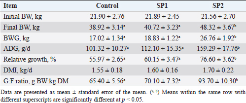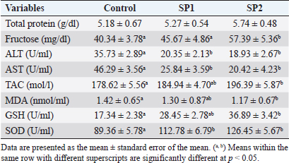 Table 4. Blood plasma concentrations of biochemical and enzymatic variables of Barki lambs supplemented with SP levels of 0 ml (control), 50 ml (SP1), and 100 ml (SP2)