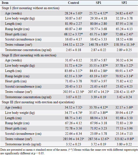 Ethical approvalThe experimental procedures were approved by the University Ethics Monitoring Committee by following the guidelines of the Animal Welfare Committee. Evaluation of the growth performance and feed efficiencyDuring the experimental period, each lamb’s live BW was measured every 15 days before morning feeding by using an electronic lamb scale. The height of the hips, the body length, and the heart circumference were also measured during puberty. The distance between the point of the shoulder and the pin bone was used to measure the length of the body (Afolayan et al., 2006). Using Ibrahim’s (2015) formula, the heart girth was measured by calculating the circumference behind the legs. While the height of the rump was measured according to Afolayan et al. (2006) from the hips to the hoof wall. Daily feed intake in dry matter (DM) was calculated by recording the weight of offered feed and feed refusals for each lamb. DM content was assessed by drying samples in a 100°C oven for 24 hours, while ash content was obtained by incinerating samples in a muffle furnace at 550°C for 3 hours. The AOAC technique (1990) was used to determine the amount of crude protein (CP), neutral detergent fiber (NDF), and acid detergent fiber (ADF), respectively. A BW body weight gain (BWG) per kilogram of DM intake was determined for each lamb’s increase in feed ratio. In addition, the relative growth was calculated according to the following equation: the relative growth=(final BW-initial BW)/initial BW × 100. Assays for pubertyAll animals were witnessed twice weekly to detect puberty improvement from the initiation of the study until the observation of puberty. Sexual behavior for each lamb was noticed as stated by El-Khalifa et al. (2013) technique. In brief, male lambs were watched within 25 minutes using estrus female, considering the following conditions: mounting without an erection (stage I), mounting with first protrusion of the penile (stage II), and puberty as age at the first collection of motile sperm (stage III). Moreover, testicular traits (scrotal circumference, and testes volume) were measured at each stage of puberty. An elastic tape was used to measure the circumference of the scrotum at the point of maximum circumference of the paired testes. Previously described methods were used to assess testes volume (El-Zelaky et al., 2011; Mansour, 2021). Blood samplingThroughout the study (from weeks 16 to 40), blood samples were collected from the jugular vein in a heparinized tube once a week. As soon as blood was collected, plasma was removed from it by centrifuging at 1,500× g for 15 minutes at 4°C, aliquoting, and storing it at −−20°C until it was needed for the examination. Blood biochemical and enzymatic variables assayAt week 16 of the study and every 4 weeks thereafter until the end of the study blood plasma was used to analyze the biochemical traits (total protein, glucose, cholesterol, and triglycerides), and enzymes activities [alanine aminotransferase (ALT), aspartate aminotransferase (AST), Superoxide dismutase (SOD), Reduced glutathione (GSH), total antioxidant capacity (“TAC”), malondialdehyde (“MDA”)]. All the previous traits were analyzed by using commercial kits (Diagnostic Product Company, Los Angeles, CA), and a microplate reader according to the manufacturer’s instructions. Testosterone examinationPlasma testosterone concentrations were determined by Radioimmunoassay (RIA) procedure using a commercial kite (Diagnostic Product Company, Los Angeles, CA). Assay sensitivity was 0.2 ng/ml with a coefficient of variation of <10%. Semen and seminal plasma collecting and evaluationLambs were ejaculated twice weekly for 2 weeks to collect semen samples. Each lamb was sampled after reaching stage III of puberty. Immediately after being transported to the laboratory, the semen ejaculates were immersed in a 37°C water bath to evaluate the quality of the semen. Sperm cell counts, volume, initial motility, live spermatozoa, and abnormal sperm percentage were examined in semen samples. Seminal plasma was collected by centrifugation at 1,500 × ɡ for 15 minutes at 4°C and stored at −20°C until analysis. Seminal plasma metabolites including total protein, fructose, ALT, AST, TAC, MDA, GSH, and SOD were measured using commercial kits (Diagnostic Product Company, Los Angeles, CA), and a microplate reader according to the manufacturer’s instructions. Statistical analysisData were analyzed with two-way ANOVA, using the general linear model procedure adapted of Stat View 5.0 (SAS Institute Inc., Cary, NC) and JMP 6 (SAS Institute Inc., Cary, NC). All values are presented as means ± SEM and differences among means were tested according to the Tukey test. The differences were considered to be statistically significant at p < 0.05. ResultsGrowth performance and feed efficiencyThe final BW, BWG, average daily gain (ADG), and relative growth were greater (p < 0.05) in SP2 lambs compared with the control and SP1 lambs (Table 2). While daily dry matter intake (DMI) was not affected by SP treatment. In contrast, feed efficiency (G: F ratio) had significantly improved in SP2 treatment as compared to SP1 and control groups. Puberty developmentThe progress in the reproductive performance of the lambs prepubertal and up to puberty is illustrated in Table 3. The SP2 lambs had reached stage I of puberty (first mounting without an erection) at early ages (p < 0.05) compared to control lambs. Furthermore, the SP2 lambs have attained stage III of puberty (first mounting with erection and ejaculation) at more early ages (p < 0.05) than control lambs. However, the lambs’ ages at stage II of puberty (first mounting with an erection) were not different. While, at stage II of puberty, the SP2 lambs had the tallest (p < 0.05) body length and rump height compared to SP1 and control lambs, respectively. In addition, the heart girth of SP2 lambs was bigger than SP1 lambs at stage I