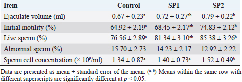 Table 6. Seminal plasma concentrations of biochemical and enzymatic variables of Barki lambs supplemented with SP levels of 0 ml (control), 50 ml (SP1), and 100 ml (SP2).