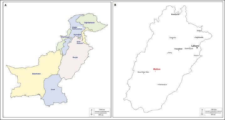 Fig. 1. Map of the Pakistani studied region. (A) Map of Pakistan showing Punjab province. (B) Map of Punjab showing the Multan district.
