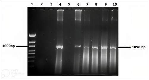 Fig. 3. Molecular detection of Theileria spp. by PCR amplification of a partial sequence (1,098 bp) of 18S rRNA gene. Lines 1: 1kb ladder; lines 2 and 3: PCR results of negative controls by using free nuclease water and Theileria spp. negative control, respectively, line 4: PCR result of positive control by using Theileria spp. positive control, line 5: PCR product of a field sample negative to Theileria spp., and lines 6–10: PCR products of field samples positive to Theileria spp. Sensitivity and specificity of PCR and microscopyThe sensitivity and specificity values for the PCR amplification diagnosis method were estimated according to Anderson et al. (1980) by using the following correlations: Sensitivity=true positive/true positive + false negative × 100. Specificity=true negative/true negative + false positive × 100. Ethical approvalEthical Research Committee of the Institute of Pure and Applied Biology, Bahauddin Zakariya University, Multan, Pakistan approved all the experimental procedures and protocols applied in this study. ResultsInfections caused by Theileria spp. were detected in the blood smears of animals, where intra-erythrocytic bodies with dot and comma shapes indicated the presence of Theileria schizonts (Fig. 2). Out of 1,200 samples of examined blood smears, 100 (8.33%) animals were positive for Theileria species (Fig. 2). Amplifications of the isolated DNA from randomly collected blood samples of 737 sheep and 463 goats showed an amplicon size of 1,098 bp which is considered positive for Theileria spp. (Fig. 3). Out of the 1,200 small ruminants examined by PCR in this study, Theileria spp. DNA was detected in 315 animals (26.25%) (Table 1). A total of 230 blood samples were detected negative in smear technique had produced specific band by PCR amplification while, out of 885 blood samples negative by PCR amplification, only 15 blood samples were found positive by a blood smear test. The sensitivity and specificity were 26.98% and 98.31% for the blood smear method, and 73.01% and 100% for the PCR test, respectively (Table 2). DiscussionOvine and caprine theileriosis is a tick-borne hemoprotozoan disease that is caused by Theileria spp. and is responsible for causing significant economic losses due to high mortality and morbidity rates. The diagnosis of ovine theileriosis is primarily based on clinical symptoms, microscopic screening of stained blood smears, and lymph node biopsy smears. However, these detection methods have limitations against Theileria spp. infection that restricts their specificity. Therefore, to overcome these limitations, the current study reports the differential diagnosis of theileriosis in small ruminants from Pakistan using both blood smear examination and PCR Table 1. Comparison between blood smear examination and PCR amplification.