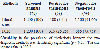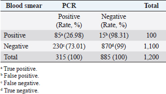 A total of 1,200 blood samples from small ruminants were randomly examined to diagnose theileriosis. The prevalence rate was found to be 26.25% by PCR, compared to 8.33% by microscopy. Of the 230 blood samples that were negative in the smear technique, specific band production was observed by PCR amplification. Conversely, out of the 885 blood samples negative by PCR amplification, only 15 were found positive by blood smear test. The sensitivity and specificity of the blood smear method were 26.98% and 98.31%, respectively, while the PCR test had a sensitivity and specificity of 73.01% and 100%, respectively. These findings indicate that PCR amplification is a more sensitive method than microscopy for diagnosing Theileria piroplasms in infected small ruminants (Table 1). Giemsa staining is a commonly used method for identifying ovine and caprine theileriosis worldwide due to its simplicity and affordability. However, microscopy is not sensitive enough to diagnose carrier animals with low parasitemia. Serological tests are also not reliable since Theileria antibodies disappear quickly, leading to negative results in carrier animals with low parasitemia (Aktas et al., 2006). These animals could potentially spread Theileria piroplasms through the animal-tick life cycle. Therefore, PCR-based molecular diagnosis is better for understanding the status of Theileria spp. infection. Several studies have reported that PCR assay is more specific and sensitive than microscopy (Oliveira-Sequeira et al., 1995; Kirvar et al., 1998; Martin-Sanchez et al., 1999; Nagore et al., 2004; Altay et al., 2005; Altay et al., 2008; Taha et al., 2010). This method allows for direct, accurate, and sensitive identification of piroplasms even in carrier small ruminants with a low parasitemia level that show no symptoms of Theileria infection. Table 2. 2 × 2 contingency for blood smear examination and PCR.