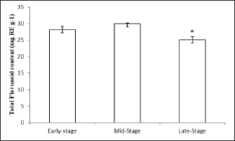 Fig. 1. Effect of different maturity stages on TPC of ethanolic okra fruit extracts. The results are representative of at least three independent experiments and are expressed as mean ± SEM (n=5). (*): Significant differences between treatment groups (p < 0.05).