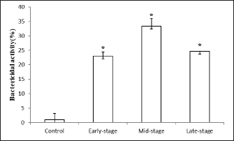 Fig. 4. Bactericidal activity (expressed as a percentage) of okra fruit extract against V. anguillarum depending on different maturity stages. The results are representative of at least three independent experiments and are expressed as mean ± SEM (n =5). (*): Significant differences between treatment groups (p < 0.05). All the antioxidant-tested activities of okra fruits varied depending on their maturity stages. While, the extract showed the highest antioxidant effect at a medium maturity, followed by fruits harvested at the beginning of maturity. While the DPPH radical scavenging activity of okra fruit was significantly lower at the late ripe stage (70.61% ± 0.15%). This result can be connected to the TPC that could be the origin of the antiradical capacity. These data are in correlation with previous results that indicate that several vegetal phenolic compounds are important sources of natural antioxidants (Khomsug et al., 2010). Bactericidal activityThe in vitro evaluation of A. esculentus L. fruits extracts bactericidal effect belonging to three maturity stages was assigned against V. anguillarum, fish pathogenic bacteria (Fig. 4). However, the results demonstrated that the viability of V. anguillarum was influenced by the fruit extract at all the tested stages. Then, as shown in Figure 4, the bactericidal capacity quantitatively varied depending on the maturity stages. Vibrio anguillarum showed a remarkable sensitivity to all okra fruit extracts. Then, the ethanolic extracts at the mid-maturity stage recorded the major inhibitory effect of the bacteria viability. Furthermore, at the three maturity stages the okra fruit extracts have noticeably affected the bacteria growth compared to the control. DiscussionThe length of fresh fruit is considered a major indicator for okra fruit harvest. Generally, the two sizes of okra fruits (small and big) are collected and consumed (Petropoulos et al., 2018). The increase in size and weight indicates an improvement in the quality of okra fruit during maturity (Uchoi et al., 2018). Besides, phenolic elements are considered crucial biomolecules in okra fruits (Hussain et al., 2012). In the same context, Shen et al. (2019) have shown that the main bioactive component in okra fruits is phenolic compounds. Whereas the fruit ripening stage had a marked influence on the secondary metabolite contents extracts. During the ripening of okra, various changes in phenolic level have been established ranging from 37.38 ± 4.22 mg GAE g−1 (late harvested fruits) to 43.27 ± 2.029 mg GAE g−1 (mid-stage maturation of fruits). Similar to our findings, previous research presented a similar level of TPC varied from 33.33 ± 0.02 to 37.38 ± 4.22 mg GAE g−1 (Mohammed et al., 2016). While, previous studies have reported a similar phenolic level in okra fruits (49.72 ± 2.24 mg GAE g−1) (Rohman et al., 2010). Otherwise, another study indicated a lower level of okra fruit phenolic content was indicated (13.456 mg GAE g−1) (Zainuddin et al., 2022). The difference in phenols concentration can also relied on the extraction technique and the polarity of the solvent used (Jing et al., 2015). In addition, these variations are often connected with the difference in geographical origin, the extraction technique used and the experimental protocol adopted (Benchikh et al., 2014). In the current study, the effect of ripening stages on flavonoids level was investigated. The medium stage of maturity reported the most important extractive yield of flavonoids (25.08 ± 0.93 g RE g−1). Our findings are in correlation with Shen et al. (2019) who highlighted the TFC variation of okra fruits during fruit maturity. Literature has explained these results by the dilution effect slowing the biosynthesis of new phenolic compounds which increase the size during ripening for fruits (Anand and Aradhya, 2005). Accordingly, with our results, Mohammed et al. (2016) indicated okra fruit flavonoid contents about 29.979 ± 0.036 mg RE g−1. In addition, similar flavonoid contents of okra fruits have been earlier expressed (31.21 ± 8.64 mg RE g−1) (Rohman et al., 2010). Whereas, Shen et al. (2019) noted that okra fruits flavonoid contents were 10 times lower than ours (2.95 ± 0.06 mg RE g−1). Generally, fluctuations in the reported flavonoid values can arise from several factors like nonrepresentative sampling, different cultivars, and different growing and, analytical conditions (Harnly et al., 2006). Besides, such variations in flavonoid contents might be due to a number of causes as well as genotype, maturity stages, environmental and post-harvest conditions techniques (Koh et al., 2009). In addition, previous research suggested, similarly, that small fruit (3–5 cm) had a higher nutritional value (Petropoulos et al., 2018). The antioxidant activity of A. esculentus L. fruits is correlated with the ripening stage. In that sense, our results showed variation in DPPH value among maturity process from 60.7% ± 0.26% to 75.64% ± 0.79%. Our findings are in accordance with Siddique et al. (2022), which highlighted that Pakistan fruit extract has a scavenging percentage of DPPH radicals around 13.487% lower than the Tunisian one. This fluctuation is caused by the existence of biomolecules such as quercetin and catechin which are more soluble in methanol as a solvent (Wahyuningsih et al., 2020). Numerous further studies have highlighted a directly proportional relationship between phenolic, and flavonoid contents and antioxidant effects of vegetable extracts (Abdel-Hameed, 2009; Shen et al., 2019). In addition, the high antioxidant capacity of okra fruit extract could be explained by its high content of phenolic compounds which function as singlet oxygen quenchers, reduction agents, and hydrogen donors (Reine et al., 2018). Otherwise, as already reported by Uchoi et al. (2018) antioxidant activity can increase depending on the maturation stage of fruits (between the beginning of okra 