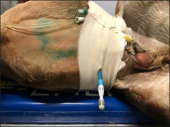 Fig. 3. Abdominal drain in Case 2. The colt’s conditions improved during hospitalization, and no abnormalities were found in clinical parameters following day 5 after surgery. Hematology and serum biochemistry were monitored twice weekly until discharge, and by day 8, all values were within normal limits. The foal was discharged 17 days following admission. Complications after hospital discharge and long-term outcome The colt showed no complications after discharge and was healthy at the phone follow-up 1-year post after the surgery. DiscussionThese case reports describe the treatment of uroperitoneum in two colts, combining surgical repair and conservative management. Uroperitoneum is a common disease in foals, with an incidence of 0.2%–2.5% (Hackett, 1984) and a higher prevalence in colts than in fillies (Dunkel et al., 2005). The reason for this sex difference has been attributed to the longer male urethra (Hackett, 1984). This condition is most frequently seen in the first week of life, whereby morbidity range can vary from 1 to 60 days after birth (Bernick et al., 2021). Trauma during delivery or afterbirth, focal necrotic cystitis, or congenital defects can lead to uroperitoneum (Schott and Woodie, 2019a). Tears usually occur in the dorsal wall of the bladder, which can be explained by the reduced thickness of this area (Kablack et al., 2000). The uroabdomen can also evolve from a rupture of the urachus, which may be a result of traction of the umbilical cord at the time of delivery (Hardy, 1998) or by umbilical infections (Mendoza et al., 2010). In the cases reported here, the rupture of the bladder was assumed to be the result of an external trauma (Case 1) or excessive traction of the umbilical cord during delivery (Case 2). In this last case, the umbilical cord has probably produced excessive stretching and trauma of the pelvic urethra, producing the rupture. Cystorrhaphy and cystoplasty are often the first choice to repair a bladder rupture (Richardson and Kohn, 1983; Adams et al., 1988; Schott and Woodie, 2019a); however, surgery and general anesthesia are associated with high mortality, particularly in metabolically compromised patients (Peitzmeier et al., 2016). Moreover, accessing tears in the ventral part of the bladder is often impossible (Schott and Woodie, 2019a). Conservative management of bladder lacerations through correction of metabolic imbalances and drain of urine using indwelling urinary catheters and abdominal drains in adult horses is advocated by some practitioners, with successful outcomes (Peitzmeier et al., 2016; Gosling et al., 2021). Abdominal drainage and urinary catheterization were considered alternative techniques to treat uroperitoneum in critically ill foals (Lavoie and Harnagel, 1988). Medical treatment associated with urine drainage is also performed to stabilize compromised foals before surgical therapy of the uroperitoneum (Kritchevsky et al., 1984; Lavoie and Harnagel, 1988; Butter, 2008). The advantages of surgical technique over conservative management include a short convalescence and antibiotic therapy, as well as the absence of complications (cystitis, peritonitis) (Schott and Woodie, 2019a). On the other hand, conservative handling of bladder ruptures avoids complications associated with recumbent surgical repair (Peitzmeier et al., 2016). At first, conservative management appeared as a possible alternative to a second surgery in both treated foals. After stabilization of the colts, a cystorraphy (Case 1) and cystoplasty (Cases 1 and 2) were performed under general anesthesia. Surgeons performed a double-layer suture without debridement of the defect, as described in the literature (Schott and Woodie, 2019a; Fubini and Delco, 2022). Suture material and pattern and the decision to debride the bladder tear margins have been associated with the development of complications (Bryant and Gaughan, 2005; Schott and Woodie, 2019a; Ford et al., 2022; Fubini and Delco, 2022). Although the recurrence of uroperitoneum appears to be more common in cases where no debridement is performed, Ford et al. (2022) have not highlighted a clear relationship between debridement procedure, uroperitoneum recurrence, or survival rate. Fubini and Delco (2022) suggested that debridement is not necessary if the bladder is closed with an inverted suture. In an experimental ovine model, performing a double-layer suture in cystotomy leads to a higher leaking pressure than a single layer (Duffy et al., 2019). Conversely, a single-layer suture pattern for cystotomy closure in 144 dogs and cats has proven to be a safe and effective procedure with minimal complications (37%) (Thieman-Mankin et al., 2012). Albeit in calves, there is some experimental evidence that a single appositional layer may be sufficient to ensure bladder closure (Bouré et al., 2005), in foals, there is no information regarding the best security of the double-layer suture than the single-layer. In our experience, the bladder suture was effective in repairing the defect in Case 1, as the endoscopy did not show any sign of suture failure; in Case 2, access to the urethral defect was not possible. A few days after the surgery, a recurrence of the uroperitoneum was diagnosed by ultrasonography (Cases 1 and 2) and endoscopy (Case 1), because of the presence of a further bladder tear that was not highlighted during surgery (Case 1) and a tear in the pelvic urethra (Case 2). A conservative management has been undertaken to solve those recurrences, since a second surgery was not considered, due to economic reasons, localization of the defect (Case 2) and to avoid all possible complications associated with another general anesthesia and surgery. Urinary catheters were placed in those patients to reduce the amount of urine accumulating in the abdomen and the tension on bladder walls (Osborne et al., 1996; Walesby et al., 2002). Catheters were placed with a sterile technique and were connected to a urine bag,