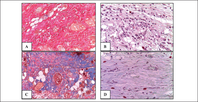 Fig. 4. The average density of types I and III collagen fibers in the skin after 3 months (left). A–control; B–single irradiation, 8 Gy; B–single irradiation, 40 Gy; G–fractional, 78 Gy. #–significant difference (p < 0.05) compared to the control. Group IV skin fragment 3 months after 78 Gy fractional irradiation. Masson stain, magn. ×200 (right). Fractionation 78 GyMicroscopic analysis The epithelium is partially absent, the dermal papillary layer is smoothed and intensely infiltrated with polymorphonuclear leukocytes, edema of the dermal reticular layer and hypodermis, collagen fibers are loosened, dilated blood vessels with endothelial detachment, aggregation, and sludge of erythrocytes were noted 10 days after 78 Gy fractional local electron irradiation, as well as the sebaceous glands and hair follicles, are destructured (Table 3). After 3 months fractional irradiation led to the growth of the connective tissue component of the skin with signs of RIF: a pronounced thickening of the dermis and hypodermis, the absence of hair follicles, and the complete or partial absence of sebaceous and sweat glands (single preserved glands are strongly destructured). Compared with the results of a morphometric assessment of the skin of the same group (IV) after 10 days, there was a weak restoration of the epidermis, a slight decrease in the thickness of the dermis (by 36.6%), and hypodermis (by 9.8%) (Table 4). Histochemical analysis According to Masson and safranin staining, fractional electron irradiation led to a pronounced increase in the volume of connective tissue in the papillary and reticular layers of the skin when stained according to Masson. The epidermis was almost completely absent in this group (Table 5, Fig. 2). Then, we performed a morphometric study of the skin stained with picrosirius red and visualized in polarized light. On the 10th day, fractional irradiation resulted in a statistically significant increase in the average density of both types of collagen fibers (especially type III) compared to the control (Fig. 3). At the same time, the morphological pattern of post-radiation fibrosis with Masson skin staining was observed after fractional electron irradiation at a total 78 Gy dose. In addition, it led to a statistically significant increase in the average density of types I and III collagen fibers compared to the control, with type I collagen being more actively expressed in the dermis (Fig. 4). Thus, the results of a morphometric study of the skin with the determination of the average density of types I and III collagen fibers were obtained, which reliably confirm the assumption of the induction of RIF in the long term (3 months) after fractional electron irradiation. Nevertheless, the changes in this parameter after a single electron irradiation were not statistically significant and approached the control values. Immunohistochemical studyAssessment of proliferation and apoptosis of keratinocytes Immunostaining of the control skin for the proliferation protein Ki-67, the apoptosis termination phase protein Caspase-3, and the proapoptotic protein p53 was localized in the keratinocytes of the basal layer and in the interfollicular epitheliocytes. Immunoreactivity of Ki-67 10 days after electron irradiation showed a dose-proportional decrease in the number of IHC-positive keratinocytes in all experimental groups compared to the control. Three months after the 8 Gy dose, the immunoreactivity of this factor did not differ from the control. After 40 Gy, it was slightly higher than in the control. At the same time, after fractional irradiation, it was 2.1 times lower than in the control. An increase in the intensity of keratinocyte apoptosis after electron irradiation was confirmed by a directly proportional increase in Caspase-3 immunoreactivity. Three months after 8 Gy of single irradiation, we observed the restoration of the immunoreactivity level of this protein to control values. After a 40 Gy dose, we found it increased by 2.46 times compared to the control. At the same time, fractional irradiation led to the maintenance of high immunoreactivity levels of this marker after 3 months. Similar immunohistochemical patterns were found when epidermis and dermis were stained with antibodies to the proapoptotic p53 protein (Table 6, Fig. 5). Assessment of the condition of the fibrous component of the skin The intensity of immunoreactivity of types I and III collagens in the dermis is directly correlated with the dose of electron irradiation, the timing of development, and the degree of post-radiation damage. Ten days after single electron irradiation in the dermis, insignificant changes in the immunoreactivity of type I collagen and an increase in the immunoreactivity of type III collagen were observed compared to the control. Fractional irradiation, after 10 days, led to the growth of the fibrous component of the dermis, which was confirmed by the immunoreactivity levels of both types of collagen fibers. It is important to note that the immunoreactivity of type III collagen predominated at this time. Three months after 8 Gy of single irradiation, the expression levels of types I and III collagens were restored. This confirms the reversibility of post-radiation skin damage in this group. On the contrary, fractional electron irradiation led to the preservation of high immunoreactivity values of collagen fibers with a predominance of type I collagen. This is a sign of the development of RIF, as the most common complication of radiotherapy (Table 7, Fig. 6). Evaluation of the inflammatory response of the skinAn immunohistochemical study revealed pro-inflammatory (IL-1β and IL-6) and anti-inflammatory cytokines (IL-4 and IL-10) in keratinocytes of the basal layer of the epidermis and inflammatory cells of the dermis of the control group. Ten days after 8 Gy and 40 Gy single electron irradiation, a dose-dependent increase in the expression levels of both pro-and anti-inflamm