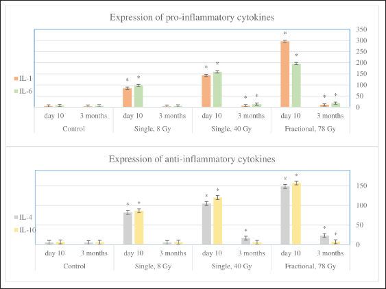 Fig. 7. The number of inflammatory cells expressing pro- (IL-1 and IL-6) and anti-inflammatory (IL-4 and IL-10) cytokines in 1 mm2 of the skin of the control and experimental groups after 10 days and 3 months. * significant differences compared to the control. A decrease in the density of microvessels in the skin, leading to tissue ischemia and, thereby, significantly reducing the rate of wound healing after 25 Gy X-irradiation was found in another study. In addition, the authors noted an increase in the expression of pro-inflammatory cytokines (TNF-α, IL-1, and IL-6), the release of cell adhesion molecules, which accelerated the migration, adhesion, and exudation of leukocytes and induced the migration of macrophages, neutrophils, and monocytes, which leads to a local inflammatory response to radiation injury (Li et al., 2022). The polymorphonuclear infiltration of the skin found at various doses of single local electron irradiation can be explained by a similar mechanism the development of inflammation, the key role which is played by the imbalance of pro-inflammatory and anti-inflammatory cytokines. These changes in the inflammatory response are most pronounced after fractional local electron irradiation. Thus, immunohistochemical analysis showed an increase in both pro-inflammatory (IL-1 and IL-6) and anti-inflammatory (IL-4 and IL-10) cytokines after 8 Gy single local electron irradiation. This was also more pronounced after 40 Gy single local electron irradiation; however, the balance of cytokines was preserved. Thus, probably that damage after 8 Gy and 40 Gy is compensated and can be repaired, and after 78 Gy irradiation decompensation occurs. Pro-inflammatory cytokines predominate over anti-inflammatory cytokines. Disruption of compensatory defense systems also occurs and all these changes lead to the development of unrepairable acute [radiation-induced dermatitis, (RID)] and late (radiation-induced skin fibrosis, RIF) post-radiation complications. Some authors have noted necrosis of keratinocytes, which is pathogenetically associated with ischemia due to the destruction of the blood vessels, as well as damage to the sebaceous and sweat glands and hair follicles after 45 Gy photons irradiation (Wang et al., 2013; McPartlin et al., 2014). On the contrary, in our study hair follicles were preserved at all levels of the skin and the sebaceous glands were absent, probably due to their greater radiosensitivity after 40 Gy single local electron irradiation. This fact indirectly confirms the concept of a "light" effect of electron irradiation on the skin appendages. In the study, the most pronounced skin damage was observed after electron fractions with minor damage to the vascular wall, while other types of irradiation (for example, photons, X-and γ-rays) at similar fractionation doses led to its complete destruction (Olschewski et al., 2006). The molecular mechanisms of radiation-induced cell death are still poorly understood. The revealed imbalance between proliferation and apoptosis of keratinocytes, including those caused by irradiation, leads to Bcl-2 deactivation and p53 induction. This is accompanied by a decrease in the cell pool due to the modulation of glycogen synthase kinase-3 (GSK3-), extracellular signal-regulated kinase (ERK-), and Ras/Raf/MEK-1 signaling pathways (Wang et al., 2006; Morel et al., 2009). A decrease in the number of Ki-67-positive keratinocytes, which is associated with the direct toxic effect of ionizing radiation on actively proliferating cells, in which the destruction of cell membranes and the structure of macromolecules (DNA, RNA, proteins, lipids, and so on), as well as modulation of MAPK, PI3K, and NFκB signaling pathways, proteins of the ErbB family, and disruption of cellular respiration at the level of the electron transport chain in mitochondria was observed after 8 Gy and 40 Gy. All these processes lead to an imbalance of the antioxidant and prooxidant systems (Reisz et al., 2014). In addition, the observed inhibition of keratinocyte differentiation is associated with damage to such signaling pathways as: PI3-kinases/Akt and Ras/Raf/MEK-1, as well as GSK-3 and ERK (Wang et al., 2006). Modulation of the activity of the above cascades leads to chromatin condensation and DNA fragmentation, i.e., apoptosis, confirmed by an increase in the number of caspase-3- and p53-positive cells. Apoptosis is activated via extrinsic and intrinsic pathways and caspase-3 is responsible for the terminal phase. The cell cycle regulator is the proapoptotic protein p53, which also was increased. It should be noted a decrease in the number of mitotically dividing generations of epidermal basal layer keratinocytes was observed after single electron irradiation (Martincorena et al., 2015). Thus, the results of the IHC study showed a shift in the proliferative-apoptotic balance toward keratinocyte apoptosis, which is most pronounced in the fractional group compared to single electron irradiation (Reisz et al., 2014). Therefore, unlike other types of ionizing radiation, electrons show the smallest depth of skin damage. Many studies have reported skin fibrosis after inflammation in response to injury, thermal and chemical burns, and radiation. In turn, inflammation (RID) is described as a consequence of ionizing radiation, which contributes to the destruction of macromolecules and cell membranes with the formation of ROS, and oxidative stress develops. This leads to inflammatory infiltration and disruption of the connective tissue structure (i.e., a decrease in the density of collagen fibers) (Sultan et al., 2011). For example, ROS destroys the endothelium of small-caliber blood vessels, triggering a cellular inflammation (Yoshimura et al., 2013). This leads to the activation of pro-inflammatory cytokines, an increase in the expression of which was found in all irradiated groups. However, in response to the ROS release an increase in antioxidant system enzymes has been 