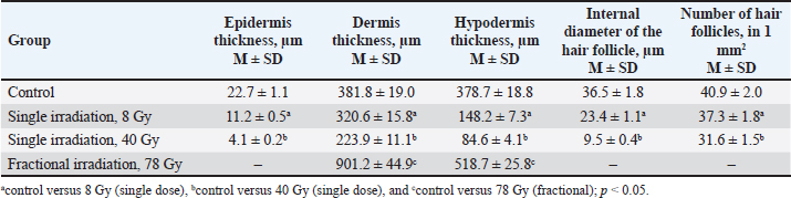 Animals were removed from the experiment by ketamine+xylazine high concentrations in accordance with the design of the experiment. The Radiation Therapy Oncology Group (RTOG) acute radiation morbidity scoring criteria and RTOG/European Organisation for Research and Treatment of Cancer (EORTC) late radiation morbidity scoring scheme were used to assess early (acute) and delayed side effects of radiotherapy. Histological examinationSkin fragments after fixation in a buffered formalin solution were prepared according to a standard protocol and stained with hematoxylin and eosin. The obtained histological micropreparations were analyzed by three blinded pathologists in 10 fields of view of a light microscope. Histochemical examinationOne slide from each batch was stained with Masson, safranin, and picrosirius red. For the specific detection of collagen fibers and assessment of the degree of fibrosis in the dermis, the histochemical staining method according to Masson (Weigert's hematoxylin, acid fuchsin, phosphomolybdic acid, and aniline blue) was used. To specifically identify collagen fibers and assess the degree of fibrosis in the dermis, a histochemical staining method with picrosirius red (Mayer's hematoxylin, Sirius red F3BA, picric acid) was used. For the specific detection of cytoplasmic granules of mast cells in the dermis, a histochemical method of staining with Safranin-O, which binds to acidic proteoglycans and belongs to the group of basic stains, was used. Morphometric analysis of micropreparations stained with hematoxylin and eosin was carried out in 10 randomly selected fields of view of a light microscope at ×400 magnification. Then, we calculated the thickness of the epidermis, dermis, and hypodermis, the inner diameter of the hair follicle, and counting the number of hair follicles using a video microscopy system (Leica DM2000 microscope) and Leica Application Suite, Version 4.9.0 software. Computer morphometry was performed using the ImageJ computer image analysis system. The number of collagen fibers in the sections was measured using an image analysis computer program (BMI plus software, BumMi Universe Co.) and expressed as a percentage of the area occupied by collagen fibers in the upper dermis. The number of mast cells after staining with safranin was determined by computer morphometry in 10 fields of view with a total area of 1.6 mm2, then the quantitative density of mast cells per 1 mm2 was calculated by the formula: