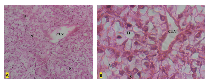 Fig. 1. A and B Liver tissue of the control specimens: (H) hepatocytes, (CLV) centro lobular vein; (S) sinusoids; (N) nuclei within hepatocytes. A (HE × 20) and B (HE × 100). Second, the liver of the FA-treated specimens showed a relative loss of liver integrity through the appearance of significant vacuolization and SD in comparison with OTC samples (Fig. 3). Several cases of nucleus reduction were also obvious in many analyzed areas. Moderate congestion was recorded in major blood vessels. As an extreme impact of the application of FA, a restrained focal necrosis of the hepatic tissue was registered. Finally, in the histological assessment of specimens’ livers exposed to the combination of FA and OTC, the following alterations were observed. The histological integrity was lost throughout the liver sample (Fig. 4). Individual hepatocytes were not always clearly visible. The histological structure did not appear relatively intact. The hepatic cord structure associated with normal fish liver histology was not clearly visible. Highly vacuolated hepatocytes were observed in the majority of investigated areas. As was the case with specimens exposed to FA, congestion was observed in most blood vessels with a prevalent SD. By the end, and in a more severe level of alteration, nuclear degeneration and necrosis of the hepatic tissue were also evident in several investigated areas.