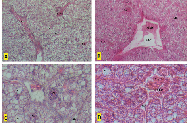 Fig. 4. A–D: Liver tissue of the formaldehyde 37% and OTC treated specimens: (Ne) Necrosis; (V) vacuolation; (SC) sinusoid congestion; (CV) central vein with melanomacrophage centers (MMCs); SD; (CLVC) centrolobular vein congestion; (RBCs) red blood cells. A and B (HE × 10) and C and D (HE × 100).