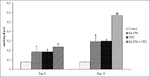 Fig. 6. Malondialdehyde (MDA) assessment in the liver of the sea bass control group, sea bass exposed to FA 37% (Formaldehyde), OTC (oxytetracycline), and FA 37% + OTC, respectively. (a) Significantly different from the control at P ≤ 0.05. (b) Significantly different from other treatments at P ≤ 0.05. To investigate the probable interaction between these chemicals, their combined effects were evaluated. The exposure lasted for 10 days during which two samples were achieved; the first at day 5 and the second by the end of the experiment. Results indicate that the exposure to FA and OTC induced significant histological alterations in the sea bass liver. In the case of FA, obtained results are expected since it was previously reported that fish species are particularly sensitive to formalin, and even lower doses could adversely affect many fish species if used repeatedly (Omoregie et al., 1994; Omoregie et al., 1998; Yacoob et al., 2002; Santos et al., 2012). From histopathological viewing, FA induces many changes in the Amazon ornamental fish, blue-spotted coridora (Corydoras melanistius). Indeed, when exposed to ten concentrations of formalin (40%) (0, 3, 6, 12, 25, 50, 100, 150, 200, and 250 mgL-1for 96-hours, Rainbow trout showed severe histopathological changes such as gill hyperplasia, with a filling of interlamellar spaces, disorganization of liver arrangement (Santos et al., 2012). Moreover, liver tissues of Nile tilapia, Oreochromis niloticus L. fingerlings showed vacuolated areas (Perera and Pathiratne, 2005). Moreover, FA induces toxic effects in both liver and kidney silver pomfret (Pampus argenteus). More recently, Bulut et al. (2015) showed that 250 mg L-1 (1 hour) and 500 mg L-1 (45 minutes) concentrations of FA in aquaculture of Rainbow Trout caused interlamellar necrosis and degeneration of the muscle tissue, dilatation in the liver, congestion in veins, and degeneration in hepatocytes and damage in the blood vessels. It is mentioned that formalin causes tissue damage and shows genotoxic effects even at 15 mg L-1 in Nile tilapia. All these observations are in agreement with our findings, as a matter of fact, we found that the therapeutic exposure to FA has mainly induced SD and intensive vacuolization. Hepatocytes from FA-treated groups were distinguished from the reference by a greater degree of vacuolation. In parallel, OTC-exposed specimens did not differ significantly from the reference group, and the hepatic damage was limited to SD and slight vacuolization. Accordingly, Elsayed et al. (2013), revealed that a 40 mg kg-1 dose of OTC basal diet showed non-significant increases in chromosomal aberrations compared with control in Nile Tilapia fish. In a retrospective view, it is clear that recorded alterations depend on the treatment at both quantitative and qualitative levels. Hence, FA-treated groups have shown more severe damage than the OTC ones. It is also noteworthy to mention that the observed alterations were particularly well pronounced at the end of the experiment and that five days of exposure was not enough to induce relevant liver changes in comparison with the control. In the present study, the absence of necrosis and fibrosis in specimens’ livers exposed to OTC and to FA separately suggests that the accumulation of lipids was relatively mild and that consequently may not be pathological. However, as was mentioned in our results, the combined exposure to FA and OTC has induced more severe histopathological alterations characterized by necrosis and intensive blood vessel congestion. Thus, it is obvious that the combined use of both tested chemicals presented a considerable additive effect and precautions should be paid during their parallel use and particularly during their release to the receiving environment especially because of the persistent proprieties of OTC (Kerry et al., 1996; Coyne et al., 1997). Observed alterations were particularly well pronounced at the end of the experiment and those five days of exposure were not enough to induce relevant liver changes in comparison with control. The administration of FA and OTC disrupted the hepatic architecture of the treated fish. Thus, histopathological changes covered inflammatory disorder, which might be due to the generation of reactive oxygen species (ROS) that provoked damage to different membrane constituents in hepatocytes (Rjeibi et al., 2016). Besides that, variations of CAT and MDA between treated and control groups are an indication of oxidative stress induction and consequently a general metabolism perturbation Correspondingly, in our study it was obvious that FA has induced significant oxidative stress seen as CAT activity induction and increase in the MDA tissue content as shown by the generation of ROSs of animal exposed to FA, inflammation, neurodegenerative disorders and carcinogenesis (Lambert and Shank, 1988; Kilburn, 1994; Gurel et al., 2005; Saito et al., 2005; Jung et al., 2007; Vosoughi et al., 2013). As was the case with FA, the present study clearly shows that OTC induced oxidative stress in the liver tissue. However, the magnitude of oxidative damage was significantly less important than FA treated group. It is demonstrated that OTC acts through the inhibition of mitochondrial β-oxidation disturbing the respiratory chain and generating superoxide anion which are important in the production of both ROSs and nitrogen species (Gibson, 2005). In the same context, showed that OTC increased lipogenesis, induced oxidative stress, damaged the mitochondrial structure and functions, and inhibited the lipolysis in the liver tissues and hepatocytes of grass carp Ctenopharyngodon Idella (Xu et al., 2021). These reactive species could damage the cell membrane as a result of lipid peroxidation (Skakun and Vysotski, 1982; Lopez-Pedrera et al., 2016). In accordance with our study, Reda et al. (2013), reported that after 12 weeks of the feeding of cultured O. niloticus with a basal diet supp