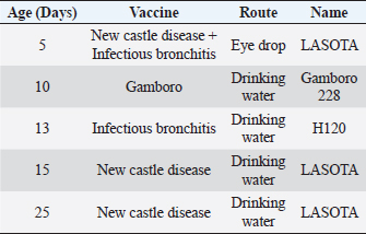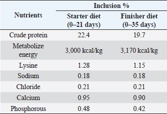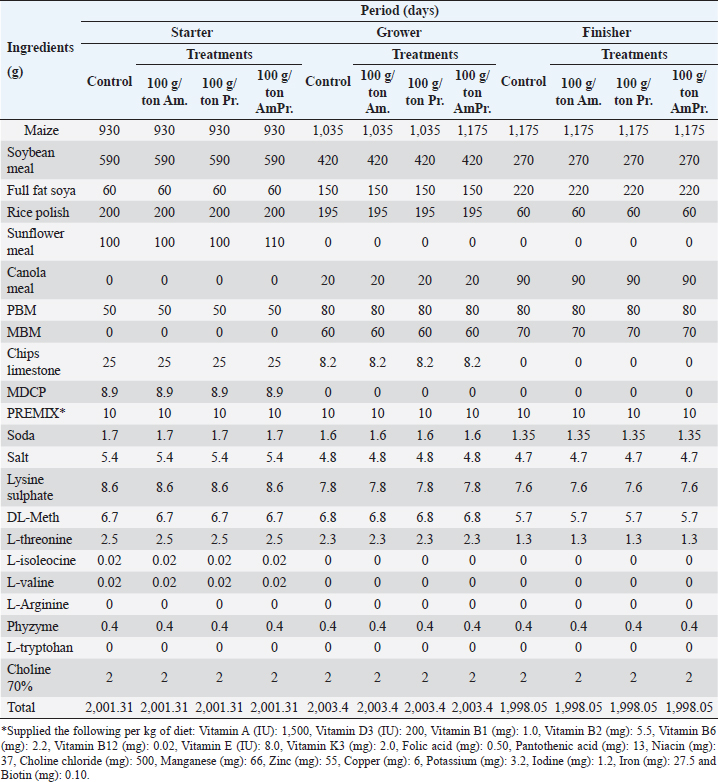 Experimental diet and feedingFour experimental diets were formulated (Tables 2 and 3), i.e., controlled, 100 g per ton of amylase, 100 g per ton of protease, and 100 g amylase + 100 g protease per ton of feed. A weighing of the birds was performed at the beginning and the end of the experimental period. FI, BWG, and FCR were also recorded weakly. Data collectionBody weightAn electrical weighing balance was used to determine the initial weight of the chicks when they arrived. Chicks were weighed weekly in each replicate after that. Table 2. Composition of experimental diets.