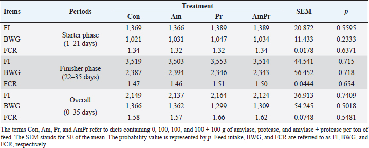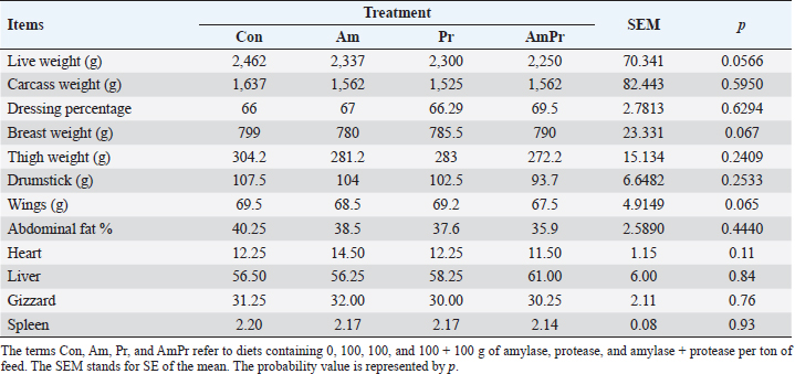 Statistical analysisThe experiment was a completely randomized design. All the experimental data were subjected to the analysis of variance using SPSS (SPSS, 2019). Where statistical significance was observed, the mean values were separated using Duncan’s multiple-range test (Duncan, 1955). Ethical approvalThe research was conducted at Sind Feed and Allied Products R&D broiler farm, Karachi, Pakistan, following the Animal Care Ethics. ResultsFI, BWG, and FCR as affected by dietary amylase, protease, or their combined supplementation are presented in Table 4. Amylase, protease, and their combination did not significantly affect the birds’ FI, BWG, and FCR in the overall period (p > 0.05). In the same context, the effects of dietary amylase, protease, or their combined supplementation on carcass characteristics and organ weight in broilers are presented in Table 5. The analysis of variance showed supplementation of amylase, protease, and their combination have no significant impact on live weight, carcass weight, dressing percentage, thigh weight, drumstick, abdominal fat%, breast weight, and wings weight (p > 0.05). In addition, amylase, protease, and their combined administration into broiler feed have no significant effect on the organ weight of the birds (p > 0.05). Table 4. Effect of dietary addition of amylase, protease, and their combination on growth performance during experimental periods.