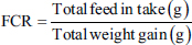 Feed intake (FI)Total FI was measured per replicate weekly. The feed offered was subtracted from the amount refused to calculate the amount of FI. The FI per bird per day was calculated using the information obtained. FI (gram/bird)=feed offered (g) − refused feed (g) Feed conversion ratioFCR was calculated from FI during the week and BWG per replicate weekly by using a formula: