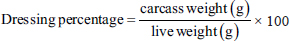 Carcass measurementUpon completion of the fifth week, three birds were randomly selected from each treatment and individually weighed. After slaughtering carcass birds had bled out sufficiently, the weight was taken before the feathers and skin were plucked. The birds were eviscerated after de-feathering. The abdominal fat and liver were taken and weighed during evisceration. The carcass was split into sections (breast, thigh, liver, gizzard, and heart) to measure each item individually.