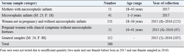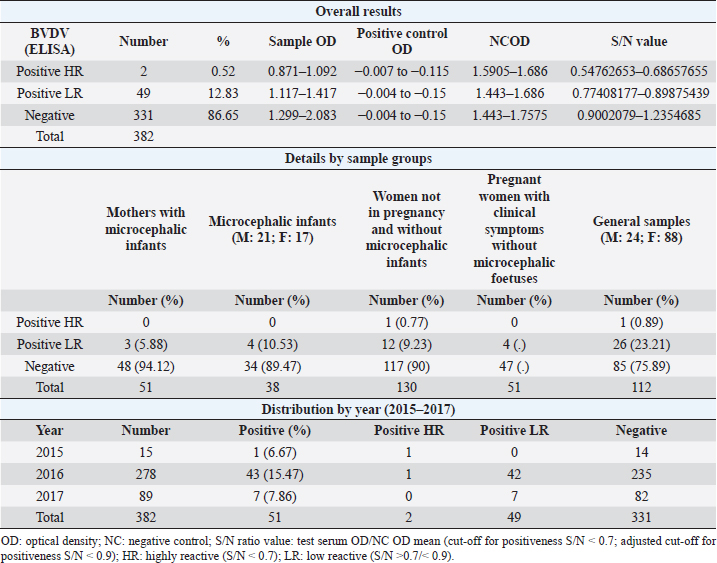 AbstractBackground: In 2015, an unprecedented epidemic of microcephaly occurred in Brazil. Preliminary observations suggested the involvement of cofactors in the etiopathology of Zika virus-associated microcephaly. Bovine viral diarrhea virus (BVDV) was identified in fetal samples with microcephaly, originating in the state of Paraíba, and two virus sequences, obtained from the amniotic fluid collected from mothers with babies affected by Zika and microcephaly, have been characterized as two different species of BVDV, types 1 and 2. Aim: The involvement of BVDV as a co-factor in the etiopathogenesis of Zika virus-associated microcephaly was explored. Methods: A serological screening using an ELISA test was undertaken to detect antibodies against BVDV among patients referred to the Central Laboratory of Natal, Rio Grande do Norte, encompassing microcephalic babies and their mothers, mothers and pregnants not associated with microcephaly and general patients as a control group. Results: Two samples were positive out of 382 tested (0.52%). No specific relation with birth defects could be established. Conclusions: The study might suggest serological evidence of BVDV in humans. Further studies and the application of improved diagnostic tests adapted to humans are necessary to clarify the epidemiological extent and impact of BVDV. Keywords: Bovine viral diarrhea virus, Brazil, Cofactor, Microcephaly, Zika virus. IntroductionZika virus is the agent of a disease of African origin, first reported in the late 1940s in Eastern Africa, in Uganda in 1947 (Dick et al., 1952), characterized for a long time as a mild arthropod-borne infection, causing small outbreaks in Western Africa and Asia (1960s, 1970s). Zika virus disease is transmitted primarily by Aedes mosquitoes, the same vector carrying dengue, yellow fever, chikungunya, and Rift Valley viruses. The transmission is vectorial and assured by Aedes aegypti and Aedes albopictus. However, also sexual transmission occurs, and the virus may persist in semen for about 6 months (Foy et al., 2011). Symptoms are resumed as a simile-influenza clinical course, with various symptoms such as fever, muscular and articular pain, and cutaneous rash. Neurologic complications are mainly Guillain-Barré syndrome (higher incidence in Brazil and French Polynesia), meningoencephalitis, transverse myelitis, and facial paralysis. However, the major complication is microcephaly which affects fetuses. The increased diffusion of the Zika virus seems to be linked to the expansion of A. albopictus, commonly known as the Asian tiger mosquito, originally restricted to some Asian regions and Madagascar until 1980, then spread throughout the world, from Australasia, Europe, and to the Americas. This allowed a geographic extension of arboviruses. Zika virus reached naïve human populations, causing an epidemic in Micronesia in 2007 (Duffy et al., 2009). The spread was accompanied by the occurrence of more severe clinical forms. Similarly, this was also observed for the Chikungunya virus, until 2005, considered a self-limiting and non-fatal disease, responsible in 2005–2006 in La Réunion for a serious outbreak affecting 35% of the population (265,000 ill persons) and causing 254 deaths due to meningoencephalitis (Vazeille et al., 2007). From Micronesia, the current strain of Zika virus diffused to Nouvelle Calédonie, French Polynesia, and other islands in the Pacific Ocean in 2013 and 2014 (Cao-Lormeau et al., 2016). In 2014, the virus was reported in Chile (Easter Islands), then in Brazil in 2015, and subsequently registered in numerous other countries of the Americas (Musso, 2015). All the isolates were genetically more closely related to that of Polynesia than the African strains (Calvez et al., 2018). In 2015 and 2016, Brazil lived an unprecedented epidemic of microcephaly that has not yet been fully explained (Heymann et al., 2016). Also, cases of Guillain-Barré syndrome increased dramatically. However, after 2 years, a radical decreasing trend occurred throughout Brazil. Similar decreasing trends of Zika infection and associated health complications, including Guillain-Barré syndrome, have been observed elsewhere, as in French Polynesia during 2013–2014 (Cao Lormeau et al., 2016). Previous to Zika occurrence, microcephaly was endemic in Brazil at a low rate among the population, as demonstrated by a study conducted by the Faculty of Medicine of Ribeirão Preto and the Federal University of Maranhão (Grota, 2018). Therefore, the Zika virus represented an apparent risk factor determining the increase in cases. Furthermore, a cross-sectional study on the epidemic of microcephaly due to Zika virus in Brazil (Medeiros Figueiredo et al., 2021) indicated a higher risk of microcephaly linked to the infection. It provided evidence that cases of the Zika virus occurred well before the initially suspected introduction of the virus in the country, linked with the Olympic games during the summer of 2016. In reality, epidemiological evidence suggested the entry of a new virus, indicating the presence of Zika virus in Brazil between the second quarter of 2013 and the beginning of 2014, considerably increasing the risk of microcephaly. This also corresponds to observations made in the studied area. The first case of microcephaly was retraced in June 2014 in Lucrécia, a tiny municipality of Rio Grande do Norte, well documented by typical skin rash in mother and compatible neuro-images (de Andrade and Giangaspero, 2017). However, the epidemiology of microcephaly associated with the Zika virus in Brazil suggested the occurrence of possible cofactors, suspecting an association with farmed animals. Dr. Marinho, director of information and health analysis at Brazil’s Health Ministry, raised the question of something more than the Zika virus was causing the high intensity and severity of cases, suspecting that the cattle-farming industry may indeed be involved, and looking into the 