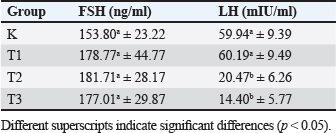 ELISA method was employed to analyze LH levels, and the obtained results indicated a consistent decrease in LH levels with increasing dosages of forest honey, as presented in Table 1. T1 group exhibited the highest LH levels, measuring at 60.19 ± 9.49 mIU/ml, which did not demonstrate a statistically significant difference when compared to group K (p-value ≥ 0.05). In T2 and T3, there was a notable reduction in LH levels when compared to T1 and C (p-value < 0.05). Among these groups, T3 exhibited the lowest LH levels, specifically measuring 14.40 ± 5.77 mIU/ml. This study found no statistically significant differences in the FSH levels between the control group and the treatment group; however, there was a noticeable trend toward an increase. The results align with the findings of a previous study conducted by Schliep et al. (2015), which observed an elevation in FSH levels among women who experience environmental stress (Han et al., 2019). The observed phenomenon can be attributed to the stimulation of the hypothalamic-pituitary-adrenal signaling system (HHA axis), which results in the suppression of the LH surge, hence preventing ovulation and impacting the levels of FSH. The observed elevation of FSH in this study is hypothesized to result from impaired folliculogenesis in the ovaries, potentially caused by the inhibition of the signal pathway mediated by the hormone HHA. An explanation regarding the elevation of FSH levels, which initiates the synthesis of estrogen, followed by a subsequent decline as the secretion of inhibitory factors commences (Bakier, 2017; Luqman et al., 2022). Elevated levels of FSH are indicative of a perturbation in the hormonal cascade, potentially suggesting an impairment in the process of folliculogenesis or anovulation disease. A significant positive association between stress levels and FSH levels. Specifically, the findings indicated that elevated cortisol levels were associated with increased FSH levels. Despite the presence of a significant amount of antioxidants in forest honey and its ability to reduce reactive oxygen species (ROS) levels in the oxidative stress model (Ackerman et al., 2012), as demonstrated in the findings of this study do not indicate any direct impact of forest honey on the enhancement of FSH levels (Stuart and Robinson, 2015). The measured LH levels in this study exhibit a downward trajectory in the T2 and T3, and they display a statistically significant difference when compared to the control group (C). Demonstrated that heightened corticosteroid levels resulting from HHA activation lead to the suppression of hypothalamus-pituitary-gonad signaling (Du et al., 2009).
