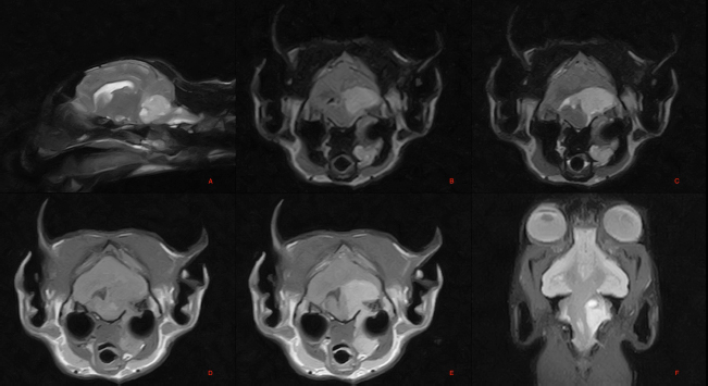 Fig. 1. Magnetic resonance imaging (MRI) of the skull: T2-weighted images of the brain, parasagittal plane (A), STIR image, transverse plane at the level of the pons (B), T2 weighted image, transverse plane at the level of the pons (C), T1 weighted image, transverse plane at the level of the pons (D), T1 weighted post contrast image, transverse plane at the level of the pons (E). Dorsal Gradient Echo T2* weighted image of the brain, dorsal plane (F). Voluminous extra axial lesion affecting the region of the left metencephalon. The necropsy revealed the presence of a voluminous dark red irregular mass which from the tympanic bulla invaded the posterior cranial fossa following the left glossopharyngeal nerve through the jugular foramen and the tympanic-occipital fissure (Fig. 2). Histological examination described a nonencapsulated, moderately cellular, rather loose, proliferation of cuboidal to columnar epithelium breaching through chunks of an otherwise normal appearing dura mater and invading some cranial nerves. Cells were arranged in papillae, large cystic lacunae with low amount of faintly eosinophilic amorphous material, or glandular architecture, depending on the region considered (Fig. 3).