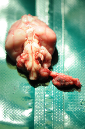 Fig. 2. A voluminous dark red irregular mass following the left glossopharyngeal nerve through the jugular foramen and the tympanic-occipital fissure. These cells were supported by a moderate amount of moderately vascularized stroma. Cells presented with moderate anisocytosis and mild anisokaryosis with variations in between cuboidal and columnar ciliated epithelium, mildly increased nucleus/cytoplasm ratio, and nonpolarized nuclei. There were 15 mitoses in 5 high-power fields. Immunohistochemistry for pancytokeratin displayed diffuse immunoreactivity of the proliferating cells (Fig. 4), also showing high ki67 positivity, while neuron-specific enolase and glial fibrillary acidic protein were negative. Sections of the cerebellum and brainstem revealed moderate, focal, impingement of the parenchyma with very mild extension of the proliferating cells into the ventral left side of the medulla oblongata. Very mild perilesional edema, mild multifocal microglial activation, and very mild diffuse astrocytosis and astrogliosis were detected at this level. Eosinophilic neuronal necrosis was also occasionally observed. Similar reactive changes of the neuroparenchyma were encountered along the ventral paramedian lobule and paraflocculus with no clear evidence of invasion by proliferating cells. Location, morphologic features, and immunohistochemical labeling were consistent with a diagnosis of ELST . Ethical approvalThis work involved the use of nonexperimental animals only (including owned or unowned animals and data from prospective or retrospective studies). Established internationally recognized high standards (“best practice”) of individual veterinary clinical patient care were followed. Ethical approval from a committee was therefore not necessarily required. DiscussionIn human medicine, diagnosis of ELST is based on the mixture of several factors including radiological, histopathological, and clinical characteristics. The main differential diagnosis, with which these tumors can be confused, is that of CPP. However, a recent review (Du et al., 2015) identified several radiological, histopathological, and clinical characteristics to allow an easier distinction between the two neoplasms: from a radiological point of view, ELSTs are characterized by strong invasiveness with destruction of the bone component of the skull base, slow growth, and a very low metastatic index (Bell et al., 2011), while CPPs tend to invade the brain parenchyma without concomitant destruction of dura mater or bone. From a histopathological point of view, ELSTs are generally characterized by a papillary-cystic glandular architecture and by the presence of a thyroid-like pattern, in which the glandular-cystic structure expands and presents a colloidal content within it (Megerian et al., 1995). Similar features also characterize the CPP, with which ELSTs have in some cases been confused. However, CPPs are mainly associated with the ventricular system, are rarely located in the cerebellopontine angle, and moreover never cause bone destruction. Additional histopathological distinguishing parameters include greater vascularization of ELSTs than CPPs (Du et al., 2015); furthermore, the nuclei of ELST are often positioned in the middle or near the apical surface of the cells of the cavity or the papillae, while the nuclei of CPP are mainly polarized and located near the basal membrane (Du et al., 2015). ELST shows various amounts of two cell types, clear cells and epithelioid cells, with eosinophilic cytoplasm; vacuoles in the cytoplasm are detectable on light microscopy in some of the human cases, while electron microscopy reveals abundance of small cytoplasmic vesicles, similar to those expected in normal endolymphatic sac epithelium (Du et al., 2015). On the contrary, tumor cells of CPP usually have pale eosinophilic cytoplasm; clear cells are scarce and cytoplasmic vacuoles are not present. Psammoma bodies often appeared in CPP (7/8 cases of CPP and 2/3 cases of atypical CPP had psammoma bodies), but are not reported for ELST. Instead, a thyroid-like structure, more predominant in ELST, seldom appeared in CPP (Du et al., 2015).