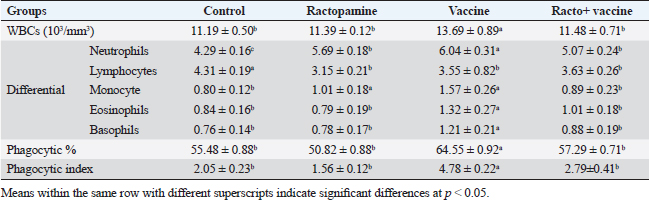 Table 2. The effect of ractopamine on total and differential count, phagocytic%, and phagocytic index in rabbits vaccinated with RHD virus vaccine (mean ± SE) (n=5).