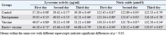 Table 3. The effect of ractopamine on nitric oxide and lysosome activity in rabbits vaccinated with RHD virus vaccine (mean ± SE) (n=5).