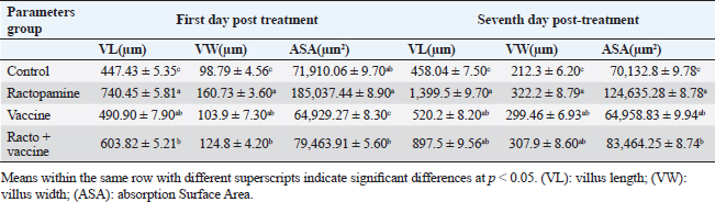 Table 5. The effect of ractopamine on intestinal characters in rabbits vaccinated with RHD virus vaccine (mean ± SE) (n=5).
