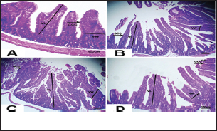 Fig. 4. Photomicrograph of intestine portions of different groups at second scarification showing mucosal demonstration for VL; VW and GCC for groups A–D consequently (H&E X bar=100 µm). The rabbits vaccinated with the RHD vaccine only or received ractopamine in the tested dose and then vaccinated with the vaccine resulted in a marked rise in WBCs, neutrophils, monocytes, eosinophils, basophils, phagocytic activity, and phagocytic index beside a significant decrease in lymphocytes. Likely, Chenggang et al. (2001) stated that the RHD virus vaccine induced an increase in WBCs, neutrophils, monocytes, eosinophils, basophils, phagocytic activity, and index due to improving the immunological status post vaccination by stimulation of the lymphoid tissue T-cell system, increasing the production of lymphocyte active substances and increasing phagocytosis of macrophage. Likely, Abd El Lateef (2006) demonstrated that the RHD virus vaccine increased the phagocytic activity and phagocytic index, besides improving the total and differential leukocytic count. Furthermore, Abd El-Wahab (2015) recorded that the RHD virus vaccine stimulates the phagocytic activity and index, WBCs, neutrophils, monocytes, eosinophils, and basophils. Similarly, Said et al. (2019) demonstrated that vaccinated rabbits had a significant rise in the leukocytic count, neutrophils, monocytes, eosinophils, basophils, phagocytic percent, and phagocytic index. Ractopamine caused marked changes in nitric oxide and lysosome. Such changes corresponded well with Yates et al. (1997) who mentioned that short- and long-acting inhaled beta2-agonists induced insignificant increases in serum nitric oxide and lysosome. Masao et al. (1999) reported that celiprolol and nebivolol, other beta-agonists caused a dose-dependent insignificant increase in nitric oxide and lysosome release. Besides, Liu et al. (2012) found that rats that received another beta-agonist named isoproterenol showed an insignificant increase in serum nitric oxide and lysosome. Niaolin et al. (2012) found that bopindolol, another beta-agonist could increase nitric oxide and lysosome production. Vaccinated rabbits in the present study either alone or in combination with ractopamine had a significant elevation in serum nitric oxide and lysosome. The same phenomenon was recorded in several reports before (Abd El-Wahab, 2015; Halaby, 2015; Ghandour, 2017; Said et al., 2019). Ractopamine caused clear changes in the protein picture of the tested rabbits throughout the experimental period in comparison with control rabbits. Likely, ractopamine decreased protein synthesis (Liu et al., 1994; Mersmann, 1998; Vandenberg and Moccia, 1998). Similarly, Spencer and Oliver (1996) found that clenbuterol suppressed the humoral immunological function. The observed higher serum albumin levels agreed with that recorded in the supplemented diet containing beta-adrenergic agonists (terbutaline and metaproterenol), and this might be due to the enhanced protein synthesis (Abadi et al., 2010). Likely, Kheiri et al. (2011) showed that broilers that received ractopamine had a marked rise in serum albumin. While total protein and globulin decreased in male Japanese quails that received 7.5 ppm ractopamine (Sayed et al., 2014). Vaccinated rabbits showed an elevation in total protein, albumin, and globulins . On similar grounds, Zheng et al. (1990) stated that γ globulin was increased in rabbits vaccinated against rabbits’ hemorrhagic disease virus. The same results were recorded before as α, β, and γ globulins were increased in the vaccinated rabbits, such increases were due to the increase in antibody-producing cells in the lymphoid organs (Villares, 1991; Perrin, 1996; Boga et al., 1997; Elkady et al., 2016; Said et al., 2019). IHC examination of the internal organs of the rabbits (liver and kidney) showed a negative expression for caspase-3 in the control and vaccinated groups only. Rabbits that received ractopamine alone or in combination with the vaccine showed a positive expression for caspase-3 in the same organs. Intestinal examination revealed an increase in the VL, VW, and absorption surface area in rabbits that were treated with ractopamine alone or with the vaccine. Likely, similar IHC observation was reported before as exposure to natural or chemical compounds (drug) induced liver injury and positive expression for caspase-3 (Fisher et al., 2015). The same change in caspase-3 was observed by Eid et al. (2015) in albino rats vaccinated with the swine flu (H1N1) vaccine. Moreover, Li et al. (2020) stated that the Newcastle disease vaccine caused a negative expression for caspase 3. ConclusionIn conclusion, administration of ractopamine could lead to several adverse effects on the immune responses in rabbits. Interestingly, using the hemorrhagic disease virus vaccine either alone or with the ractopamine could improve the immune responses in rabbits. AcknowledgmentThe authors would like to thank all staff members of the Department of Pharmacology, Faculty of Veterinary Medicine, Zagazig University, and Animal Health Research Institute, Agriculture Research Center, Egypt. Conflict of interestThe authors declare that there is no conflict of interest. Data availabilityAll data are provided in the manuscript. Any extra data needed can be provided by the corresponding author upon reasonable request. ReferencesAbadi, S., Mahboobi, N. and Riazi, G. 2010. Effects of supplemental dietary L-carnitine and ractopamine on the performance of juvenile rainbow trout, Oncorhynchus mykiss. Aqua. Res. 41, 1582–1591. Abd-elfattah, H., Marwa, M., Hanaa, S. and Mohamed, A. 2019. Effect of colibacillosis on the immune response to a rabbit viral hemorrhagic disease vaccine. Vet. Res. 43(1), 12–18. Abd El Lateff, A. 2006. Clinicopathological studies on rabbit hemorrhagic disease vaccines. Ph.D. Thesis, Cairo University, Giza, Egypt. Abd El-Moaty, A., El-Bagoury, G.F., El-Zeedy, A. and Salman, G. 2014. Egypti