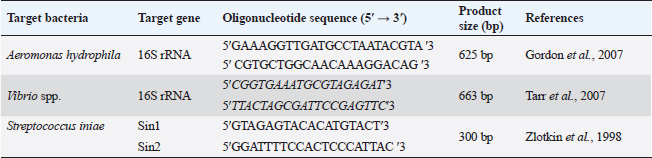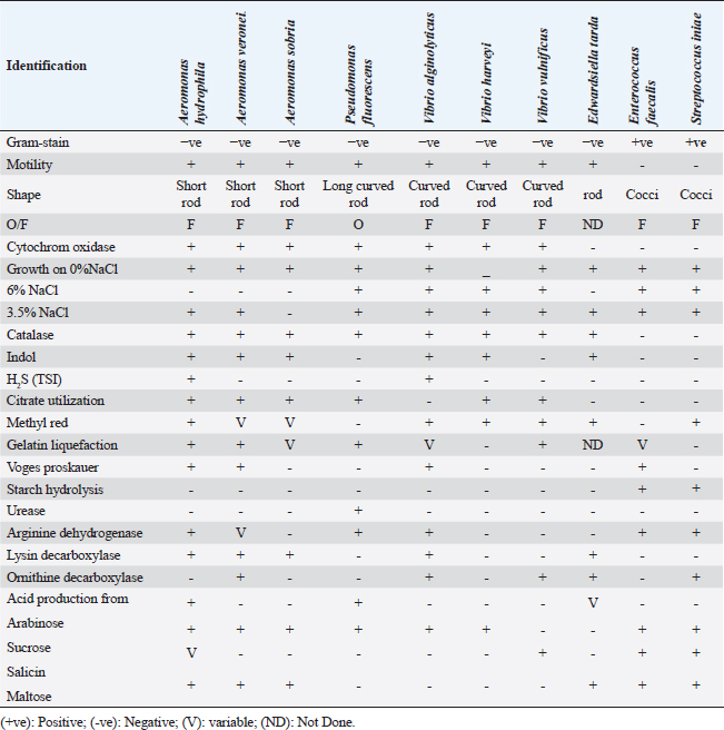 ABSTRACTBackground: The high summer mortality in many fish farms, which had detrimental economic and social implications, was a serious challenge that the fish industry had to deal with. Aim: With an examination of the most effective antibiotic, the ongoing research was intended to shed light on the identification of the main bacterial pathogens associated with the summer mortality syndrome in the diseased farmed Nile tilapia. Methods: Six hundred dead Nile tilapia samples that had suffered from summer mortality were collected from several fish farms between May and October of 2022. The gathered fish displayed hemorrhagic areas on the skin, scale detachment, fin degeneration, erosions, skin ulcers, and corneal opacity with unilateral and/or bilateral exophthalmia. The most prominent internal appearance was swelling of the internal organs with sanguineous ascetic fluid. Results: There were 225 bacterial isolates found. Six species were identified through phenotypic and biochemical analysis; they were Aeromonas, Vibrio, Streptococcus, Pseudomonas, Enterococcus, and Edwardsiella spp., in descending percentage, respectively. Aeromonas spp., Vibrio spp., and Streptococcus spp. were the three most frequent isolated bacterial pathogens. The identification of Aeromonas hydrophila, Vibrio spp., and Streptococcus iniae, the three most common bacterial isolates, was confirmed by molecular analysis by polymerase chain reaction. Most of the tested strains were found to be responsive to Ciprofloxacin (CIP), Gentamicin (CN), and Chloramphenicol (C) but resistant to Amoxicillin (AMX), according to an antibiotic sensitivity test. Conclusion: The three most dangerous common bacterial infections discovered during mass-farmed tilapia summer mortality are A. hydrophil a, Vibrio sp., and S. iniae. This makes it clear that high water temperatures may raise the possibility of bacterial infections, which could cause widespread tilapia mortality and substantial financial losses. Therefore, it is crucial to maintain a beneficial fish culture, environment, and husbandry practices to enhance the tilapia-rearing environment and lessen the virulence of the disease. Isolated bacterial strains showed low levels of resistance to AMX but were vulnerable to CIP, CN, and C. Keywords: Aeromonas hydrophila, Nile tilapia, Streptococcus iniae, Summer mortality, Vibrio sp. IntroductionAquaculture is now one of the most crucial methods for supplying the market because natural fisheries have been badly depleted and are no longer a reliable source of protein for humans (Mohamed et al., 2017; Adelekea et al., 2021). According to Reda et al. (2021), Egypt is the world’s third-biggest tilapia manufacturer and the aquaculture leading supplier in Africa. In addition to serving as an excellent provider of protein, tilapia is regarded as one of the essentials to ensuring the security of food, especially in densely inhabited nations like Egypt (Hussain et al., 2011; Abbas et al., 2017; El-Sayed, 2019). Moreover, many young individuals find employment in this sector as a means of support (Dickson et al., 2016). Extensive fish farming is unfortunately plagued by plenty of issues, such as diseases, that discourage farmers because of the financial penalties (Eltholth et al., 2015). Summer high mortality in several aquaculture facilities and the Nile Delta, which has had detrimental economic and social impacts, has been a key concern for this industry since 2013 (Fathi et al., 2017; Ali et al., 2020). The agents responsible for these outbreaks have been traced in several trials. Studies have revealed a number of variables, such as bacterial, fungal, viral, and parasitic causes, that may contribute to tilapia mortality (Yambot, 1998; Ye et al., 2011; Eissa et al., 2015; Fathi et al., 2017; Nicholson et al., 2020; Youssuf et al., 2020). Under stressed conditions, farmed Nile tilapia is vulnerable to several pathogenic microorganisms (Shaheen et al., 2013; Eissa et al., 2015). The most common cause of the large annual losses in the fish farming industry, which are projected to be worth billions of dollars (Elsheshtawy et al., 2019; Algammal et al., 2020), has been identified as bacterial infections. When water temperatures rise, opportunistic microorganisms in particular represent a serious threat to aquaculture (Pridgeon and Klesius, 2012). The potential for a bacterial infection to result in extensive fish mortality is a complex situation, and many aspects linked to the environment, host, and microbes may collaborate to show the progression of diseases (Harvell et al., 1999). Moreover, disease outbreaks may be sparked by environmental factors including temperature, salinity, oxygen level, and pH, especially throughout intensive aquaculture systems (Eissa et al., 2013). Due to the serious practices involved in fish farming, infectious illnesses constitute the main issue in aquaculture facilities and have a significant financial impact (Bulfon et al., 2015). Aeromonas veronii biovar sobria infection was linked to widespread deaths of cultured tilapia in the El-Sharkia governorate (Eissa et al., 2015; Elsheshtawy et al., 2019; Reda et al., 2021). However, Fathi et al. (2017) linked these fatalities to tilapia lake virus infection. According to Fang et al. (2004), Aeromonas is a dangerous disease that has the potential to spread internationally and produce epidemics in fish farming with extraordinarily high fatality rates. Aeromonas spp. are facultatively anaerobic, Gram-negative, oxidase-positive bacteria, according to Stratev and Odeyemi (2016). Aeromonads can be found in several kinds of foods, including fish, prawns, mussels, milk, meat, and vegetables, according to Neyts et al. (2000). They are frequently found in the aquatic environment. In tilapia farming, Aeromonas hydrophila has been found to be the most abundant species Hassan et al. (2017). Several Vibrio species are also widely recognized for their capability to lead to serious fish di